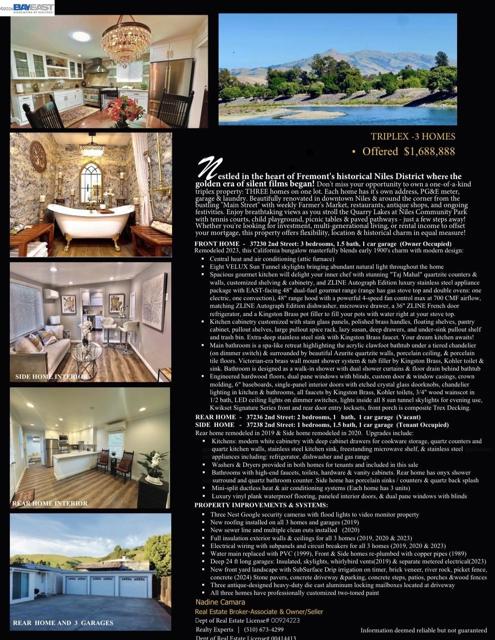 THREE HOMES! TRI-PLEX PROPERTY. Contingent sale, accepting back-up offers! Nestled in the heart of Fremont’s historical Niles District where the golden era of silent films began! Don't miss your opportunity to own a one-of-a-kind triplex property! THREE complete gut remodeled HOMES on one lot. Each home has its own address, PG&E meter, garage & laundry and shows like brand new! Whether you're looking for investment, multi-generational living, or rental income to offset your mortgage, this property offers flexibility, location & historical charm in equal measure! Each home has been beautifully renovated with the main home gorgeously showcasing Niles antique charm! YOU MUST SEE to truly appreciate: photos do not capture the quality craftsmanship and stunning design! Located just steps away from Niles Elementary School and the bustling "Main Street" with weekly Farmer's Market, restaurants, antique shops & ongoing festivities. Enjoy breathtaking views as you stroll the Niles Community Park with tennis courts, playground, paved pathways, and breathtaking Fall colors - just a few minutes walk away! Act fast! THREE stunning homes priced for the cost of two with perfect location in downtown Niles District. Bring your extended family!
