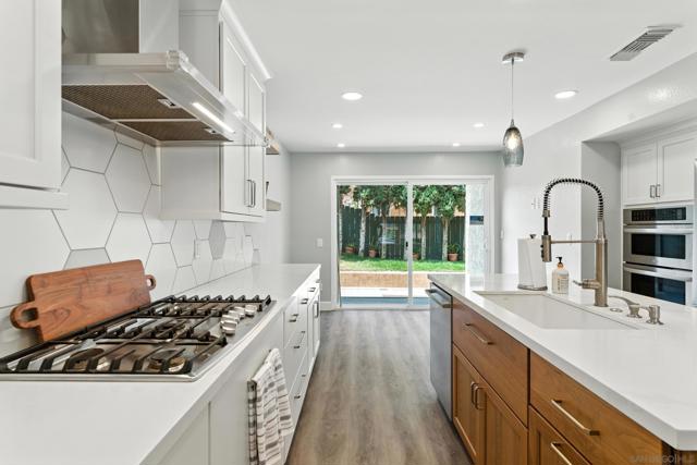 Beautifully updated 3-bed, 3-bath spacious end-unit townhome in Fashion Park Villas with 1,923 sq ft of light-filled living space. Features include vaulted ceilings, updated solid surface flooring, a modern kitchen with quartz counters, stainless appliances, and two wine fridges. One bedroom and full bath are on the main level; upstairs offers two more bedrooms including a spacious primary suite with dual sinks, soaking tub, and separate shower. Private tiled patio, direct greenbelt access, upstairs laundry, and attached oversize 2-car garage and storage area. Community pool and tennis. Minutes to Fashion Valley, parks, golf, and freeways.