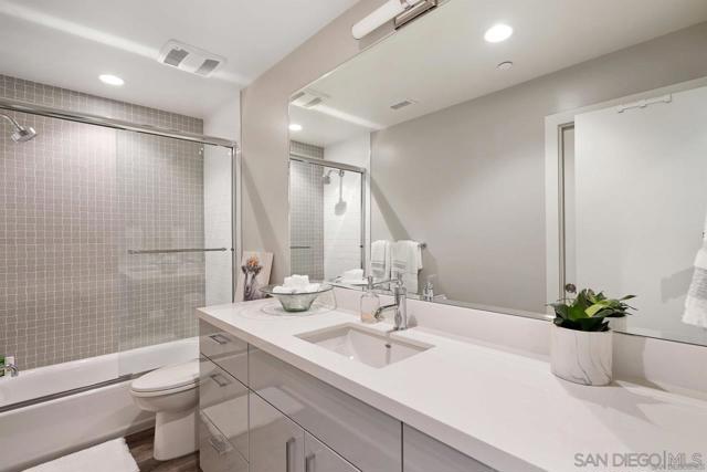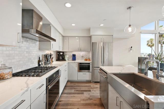 Welcome to this beautifully crafted fully furnished townhome that offers the perfect blend of sophistication and modern comfort. This corner unit boasts a contemporary showroom-style design, filled with abundant natural light and breathtaking panoramic views of the San Diego Bay, Downtown Skyline, and the picturesque Wooded Hills of Point Loma. Ideal for someone seeking a turn-key opportunity, this property is equipped with top-tier features including Jenn-air stainless steel appliances, quartz countertops, luxury vinyl plank flooring, and an oversized farm sink. Enjoy outdoor living on the rooftop deck complete with a built-in BBQ and fridge, or relax indoors with amenities such as a Juliet balcony, expansive walk-in shower, and contemporary carpet. The home also includes Kohler plumbing fixtures, a tankless water heater, high-pressure laminate designer cabinetry, and central heat & AC. For convenience, two underground side-by-side parking spots come with an added EV charger and storage space. Located close to Shelter Island, the beach/bay, and the village, this fully furnished townhome offers easy access to all the vibrant attractions San Diego has to offer, making it move-in ready for its next fortunate occupants.