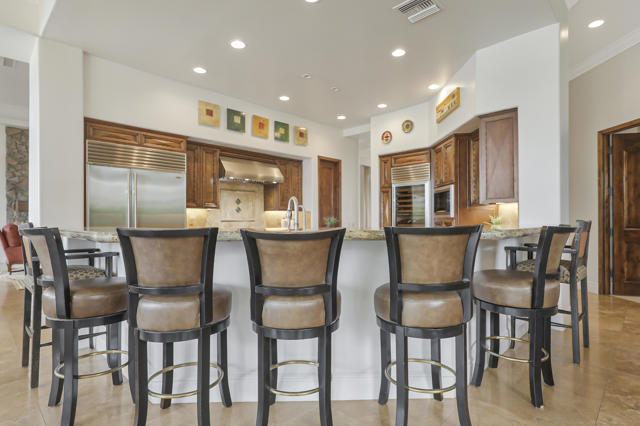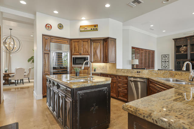 Set against a spectacular lakeside backdrop with breathtaking mountain and golf course views on the 11th hole of the Weiskopf Course, this stunning home feels like a model. Offering approximately 4,828 sq. ft. of pure luxury, it features four bedrooms, including an office, 4.5 baths, and a private two-room casita. Designed for both comfort and style, the open floor plan boasts a spacious gourmet granite island kitchen with Wolf & Sub-Zero appliances, a granite sunken bar showcasing the incredible views, and elegant 24-inch travertine floors. Additional highlights include fresh new paint inside and out, electric shades, and a private gated entry courtyard with tranquil water features.The resort-style backyard is an entertainer's dream, complete with pavers, a saltwater infinity pool and spa, an outdoor fireplace, a fire pit, a built-in BBQ, and more. The home comes fully furnished and includes a golf cart--making it completely move-in ready. With low HOA fees and an unbeatable location, this extraordinary home offers the ultimate lifestyle. Call now to schedule your private showing of this spectacular property!