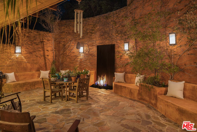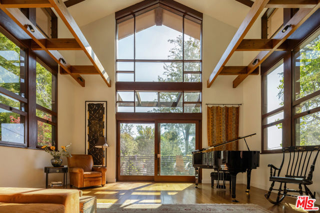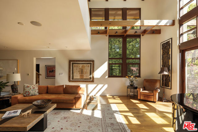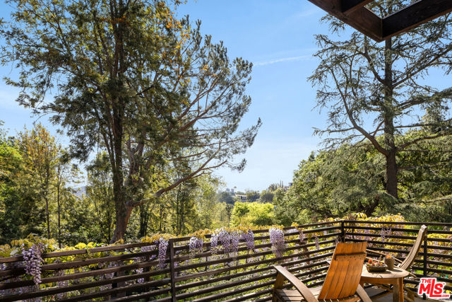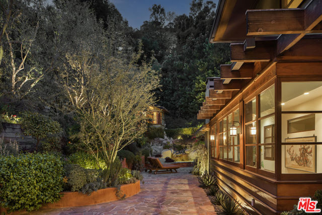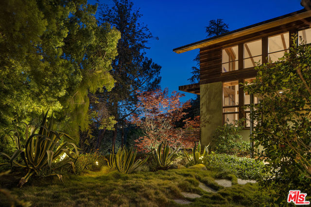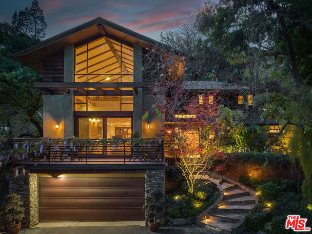 Exceptionally private and tucked at the end of a quiet cul-de-sac, this architectural retreat unfolds at the top of a long drive, surrounded by a breathtaking landscape of wild florals, mature trees, and layered landscaping. The setting feels like an enchanted garden, with a sense of peace that only deep nature and thoughtful design can provide. Floor-to-ceiling glass and large-scale windows create a seamless transition between indoors and out, allowing natural light and greenery to become a living part of the home's design. A stained-glass front entry greets with a kaleidoscope of color, leading to the grand living room boasting soaring ceilings and a dramatic sky-high gable window that creates ever-shifting light patterns as the day progresses. Wood beam accents and natural textures evoke the calm of a luxury mountain lodge, offering a true sense of escape.Nearby, the formal living room anchors the space with a wood-burning fireplace and opens through glass doors to a magical Wisteria-wrapped patio, offering treetop views and a quiet place to retreat. The dining room flows seamlessly into a warm, open kitchen centered around a handcrafted teak island and outfitted with Sub-Zero and Thermador appliances. The layout is designed for effortless connection, with the kitchen blending naturally into the home's main entertaining spaces.A glass lined gallery leads to the primary suite, offering a serene perch that looks out onto the lush gardens beyondan idyllic nook for reading or reflection. The primary bedroom is deeply tranquil, enveloped by the sound of cascading water from the nearby waterfall feature and the dappled shade of woodland-like greenery just beyond its doors. With its own fireplace, vaulted ceiling, and direct access to the backyard grounds, it functions as a private haven within the home. The spa-like en-suite bath includes dual vanities, a soaking tub with backyard views, separate shower and bidet, and a generous walk-in closet. Upstairs, a secondary suite offers sweeping views of the hillside and surrounding treetops, while two additional guest rooms, one with a balcony, share a large jack-and-jill bath. A lofted office above the living room serves as an inspiring perch, with treetop views, library shelving, and a soft soundtrack of birdsong that turns everyday tasks into a moment of calm.Outside, the home unfolds into a layered garden experience, with distinct spaces for dining, lounging, and quiet conversationevoking the timeless romance of Tuscany. A tall, ivy-draped wall frames a volcanic-stone fireplace with a custom heat-reflecting metal surround, anchoring the outdoor entertaining area with warmth and ambiance. Nearby, a built-in barbecue, alfresco dining table, and relaxed seating lounge complete the setting. The pool and spa are framed by natural rockwork and thoughtful landscaping, accompanied by a treehouse-inspired cabana with a full bathroom and sunbathing terraces tucked into private corners along the property. A lower-level garage offers two-car parking and connects discreetly beneath the home through a separate entry.Every detail from the tactile richness of the materials to the way light drifts through glass and foliagehas been composed to honor the landscape and evoke a sense of peace throughout the home. There's a transportive quality, as though it exists slightly outside of time: serene, enveloped, almost dreamlike.
