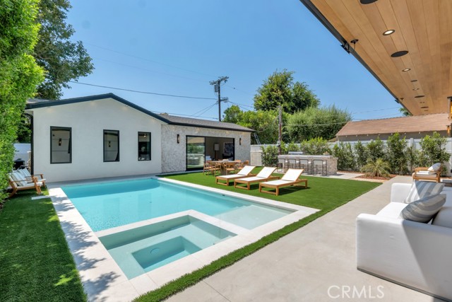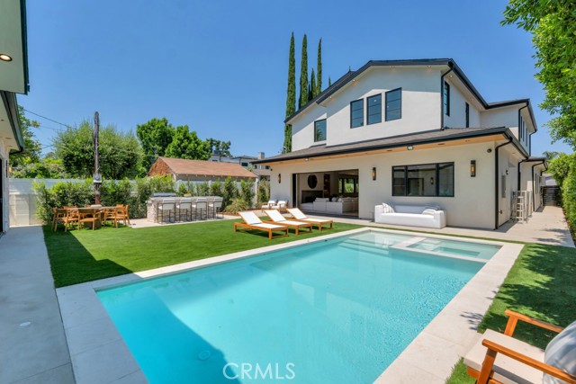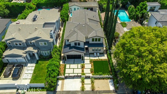 Luxurious and breathtaking New Construction estate offering 4,972 sf of meticulously crafted interiors on an 8,427 sf lot in coveted Studio City. With a striking timeless modern farmhouse architecture, and a gated entry, this residence embodies sophistication, elegance and comfort in perfect harmony. Step inside to soaring ceilings, expansive windows and wide-plank hardwood floors that bathe the home in natural light while highlighting its exquisite design details. The gourmet chef’s kitchen is a masterpiece, featuring custom cabinetry, a massive center island and top-of-the-line professional appliances. The seamless flow into the expansive dining and living areas creates the ultimate setting for both intimate gatherings and grand entertaining. Designed with versatility and modern lifestyles in mind, the home boasts a private executive office and a state-of-the-art home theater, providing both productivity and leisure at your fingertips. A fully integrated smart home system controls lighting, climate, and security, delivering effortless convenience and peace of mind. The upper level showcases four generously appointed bedrooms, each exuding comfort and style. The luxurious primary suite is a serene sanctuary with a spa-inspired bath featuring a freestanding soaking tub, glass-enclosed rainfall shower, dual vanities and an expansive custom walk-in closet. Outdoors, discover a private resort-style oasis. A sparkling pool and rejuvenating spa are framed by lush landscaping, while a covered patio and built-in BBQ kitchen provide the perfect stage for year round entertaining. Adding further flexibility and value, a detached ADU offers endless possibilities for guest accommodations, extended family or a private studio retreat. Perfectly positioned on a picturesque tree-lined street, and just moments from Ventura Boulevard’s premier dining, shopping and entertainment, this residence delivers a seamless blend of luxury, lifestyle and location.