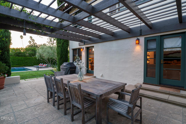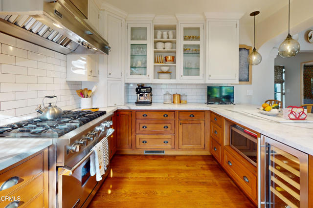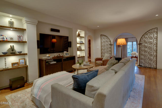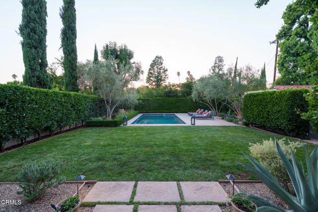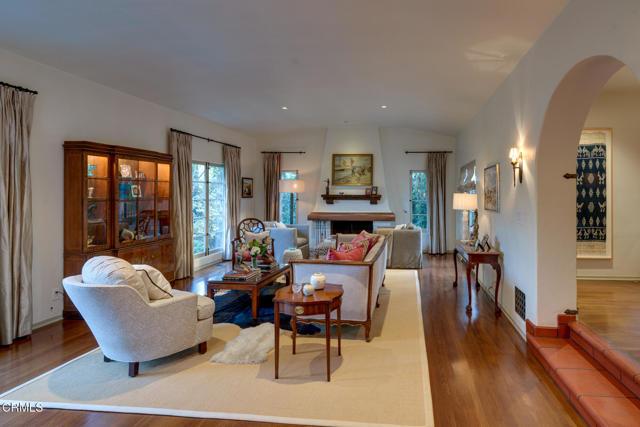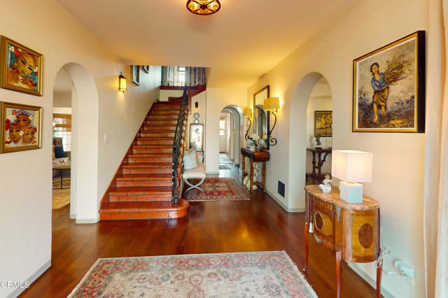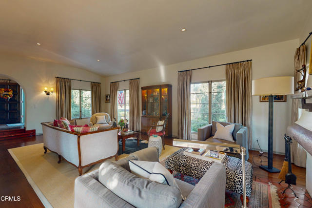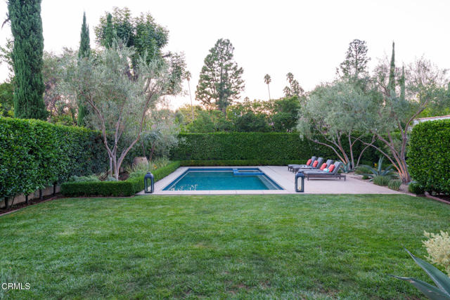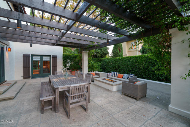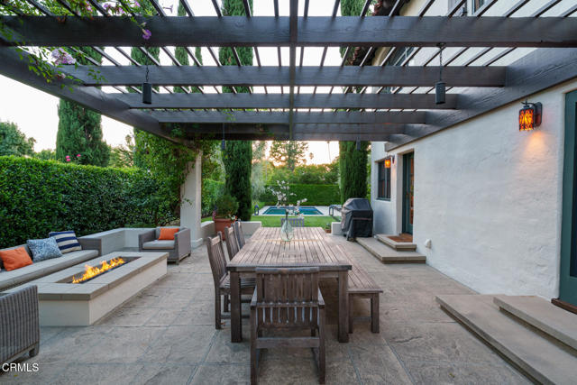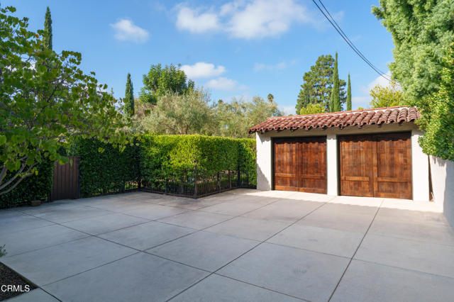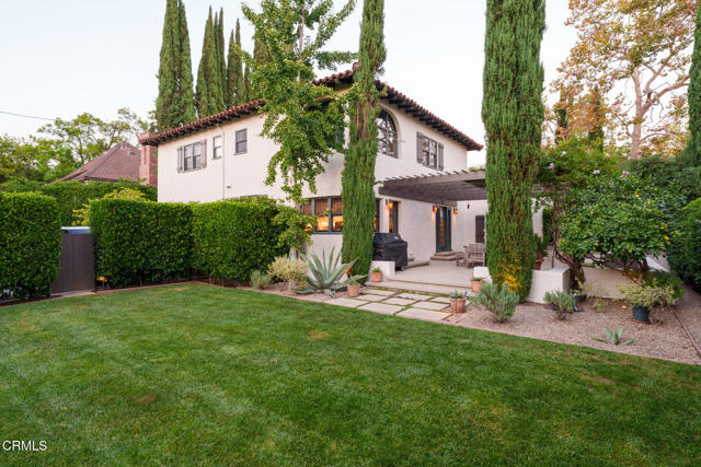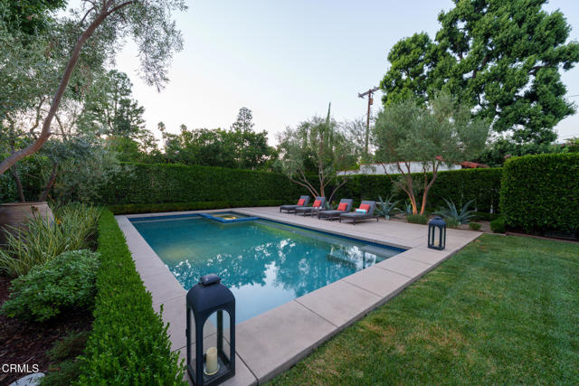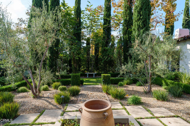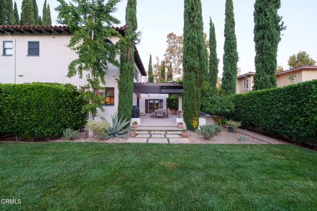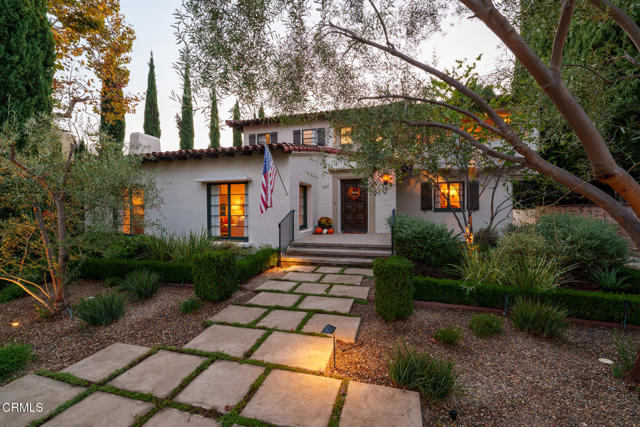 Step into the romance of old-world craftsmanship blended seamlessly with modern luxury in this 1930 Spanish Colonial Revival, completely renovated in 2014. Lush, drought-resistant landscaping by designer Gabriela Yariv invites you into this private sanctuary, featuring custom Dimmick style concrete paving and vintage Greek Pithari pottery accenting the gardens. This enchanting residence offers 4 spacious bedrooms and 3.5 designer bathrooms, & a family room open to entertaining rear yard.An entertainer's dream, the rear outdoor living space that could be accessed from the living room, family room and kitchen provides privacy as it is tucked behind mature cherry tree hedges, and includes a covered pergola adorned with pink Royal Trumpet vines, a custom-built firepit, Pebble Tec pool and spa, and multiple seating areas for gatherings day or night.Inside, rich period details meet modern upgrades. A handcrafted Magnesite staircase with antique wrought-iron railing makes a grand statement, leading into a vaulted-ceiling living room with copper-lined fireplace. The elegant flow continues through an antique wrought-iron gate to the family room, complete with a custom entertainment wall and built-in bookcases. The formal dining room features antique period light fixtures and built-in glass open shelves. One bedroom suite downstairs features custom mosaic shower, and is perfect for guests, home office or hobby room. The primary bedroom upstairs offers 2 spacious walk-in closets w/built-ins, custom upholstered wall with shelving & entertainment hook-ups & seating. Every bedroom boasts ample size walk-in closets, while the bathrooms are finished with marble, mosaic tilework, and luxurious detailing. The chef's kitchen is equipped with professional Sub-Zero and Viking appliances, a large center island with seating for 3, custom cabinetry by Woodmode, a charming breakfast nook with custom seating for 5, and original re-finished oak wood floors that run throughout. The entry door from the three-point backyard driveway leads to a pantry, drop zone with a custom bench with shelves, and laundry area that is equipped with plenty of storage cabinet, folding counter, and soaking sink.Extended driveway w/turnaround area leads to a 2-car detached garage w/custom wood doors & addtl work/storage room attached.From its antique lighting to the thoughtful blend of historic architecture and modern comfort, this home offers elegance & refined living!Top San Marino Schools!