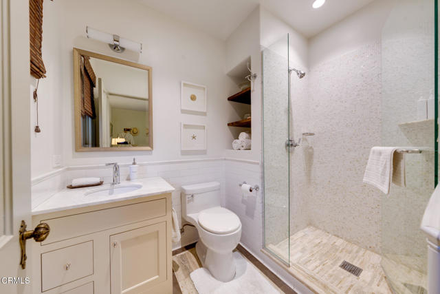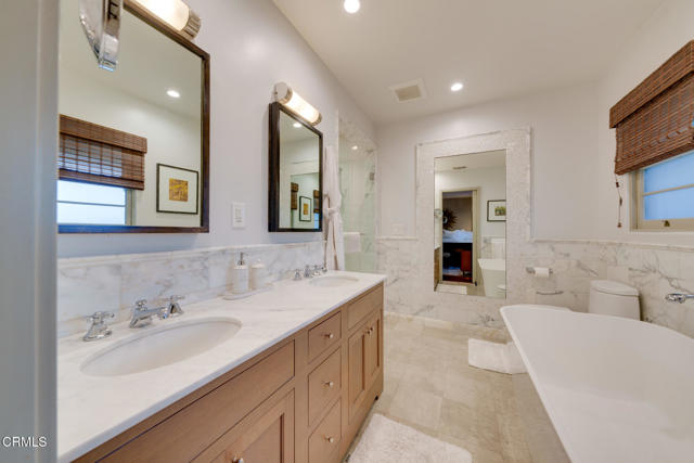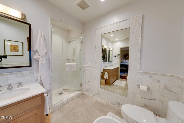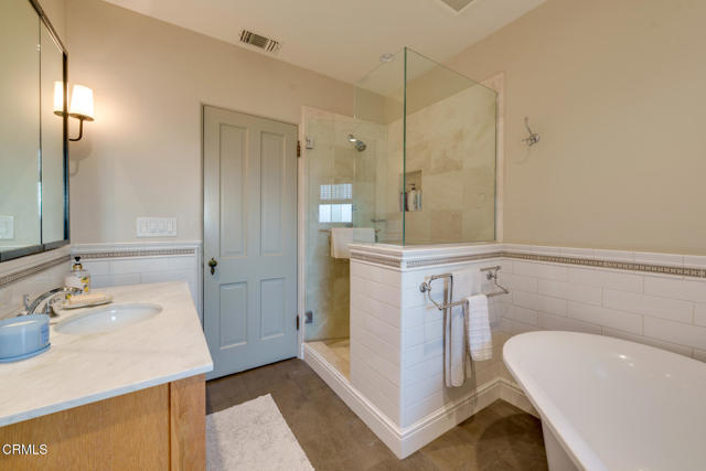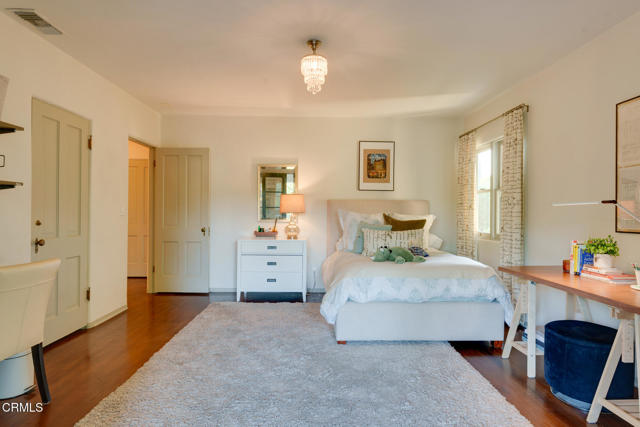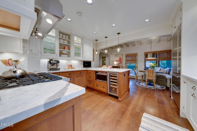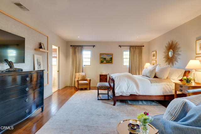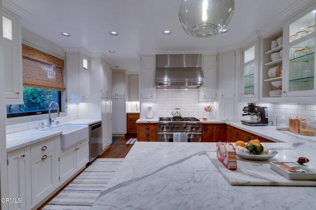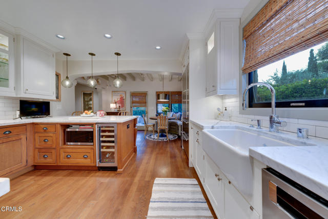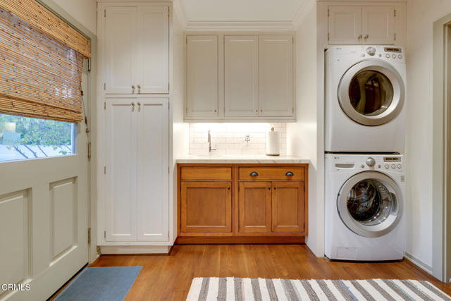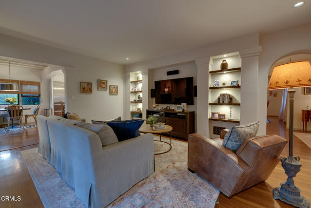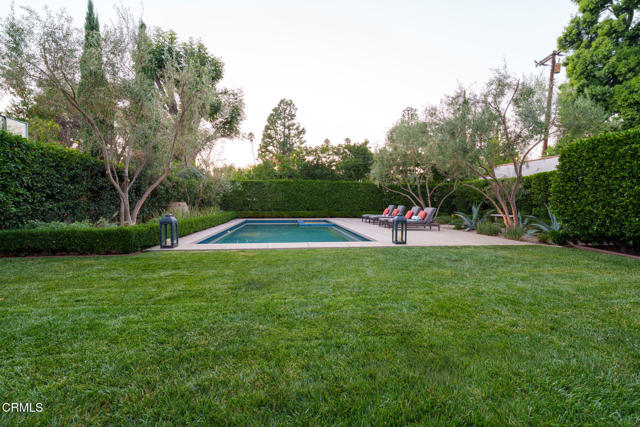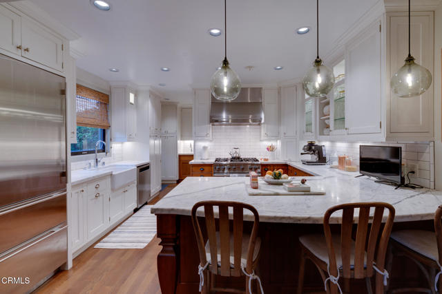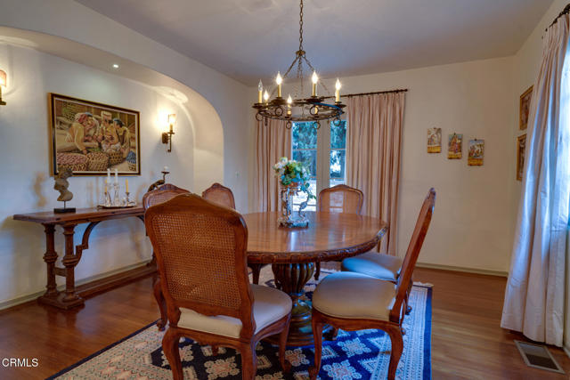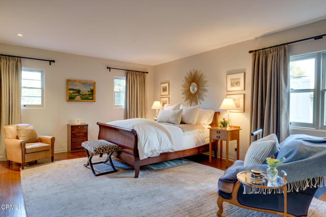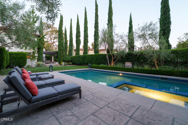 Step into the romance of old-world craftsmanship blended seamlessly with modern luxury in this 1930 Spanish Colonial Revival, completely renovated in 2014. Lush, drought-resistant landscaping by designer Gabriela Yariv invites you into this private sanctuary, featuring custom Dimmick style concrete paving and vintage Greek Pithari pottery accenting the gardens. This enchanting residence offers 4 spacious bedrooms and 3.5 designer bathrooms, & a family room open to entertaining rear yard.An entertainer's dream, the rear outdoor living space that could be accessed from the living room, family room and kitchen provides privacy as it is tucked behind mature cherry tree hedges, and includes a covered pergola adorned with pink Royal Trumpet vines, a custom-built firepit, Pebble Tec pool and spa, and multiple seating areas for gatherings day or night.Inside, rich period details meet modern upgrades. A handcrafted Magnesite staircase with antique wrought-iron railing makes a grand statement, leading into a vaulted-ceiling living room with copper-lined fireplace. The elegant flow continues through an antique wrought-iron gate to the family room, complete with a custom entertainment wall and built-in bookcases. The formal dining room features antique period light fixtures and built-in glass open shelves. One bedroom suite downstairs features custom mosaic shower, and is perfect for guests, home office or hobby room. The primary bedroom upstairs offers 2 spacious walk-in closets w/built-ins, custom upholstered wall with shelving & entertainment hook-ups & seating. Every bedroom boasts ample size walk-in closets, while the bathrooms are finished with marble, mosaic tilework, and luxurious detailing. The chef's kitchen is equipped with professional Sub-Zero and Viking appliances, a large center island with seating for 3, custom cabinetry by Woodmode, a charming breakfast nook with custom seating for 5, and original re-finished oak wood floors that run throughout. The entry door from the three-point backyard driveway leads to a pantry, drop zone with a custom bench with shelves, and laundry area that is equipped with plenty of storage cabinet, folding counter, and soaking sink.Extended driveway w/turnaround area leads to a 2-car detached garage w/custom wood doors & addtl work/storage room attached.From its antique lighting to the thoughtful blend of historic architecture and modern comfort, this home offers elegance & refined living!Top San Marino Schools!