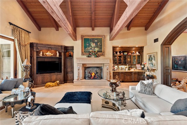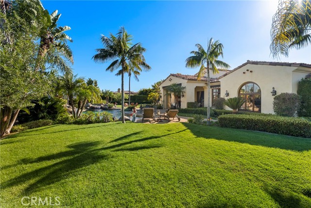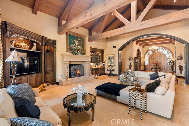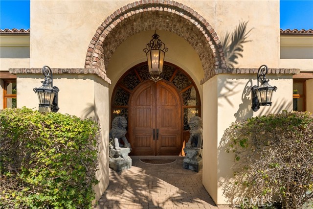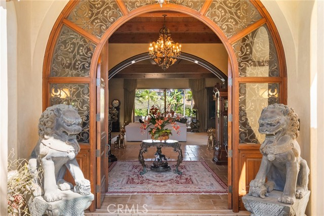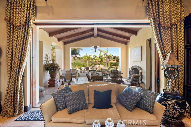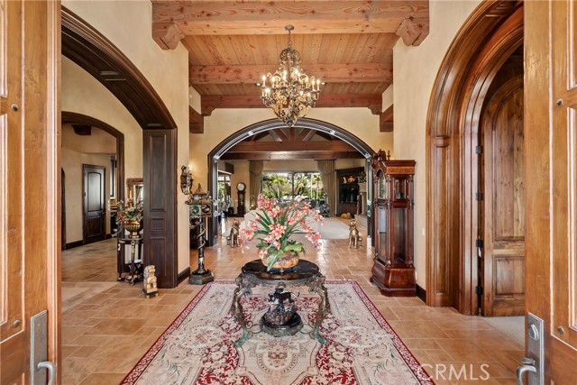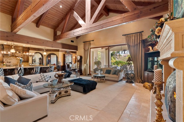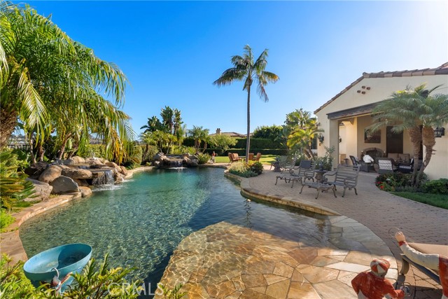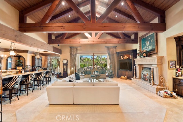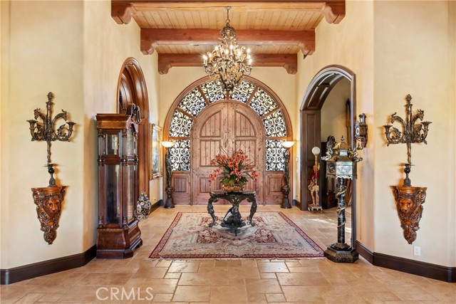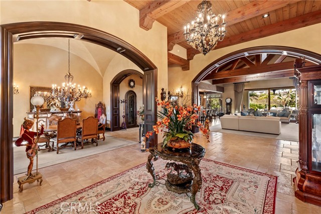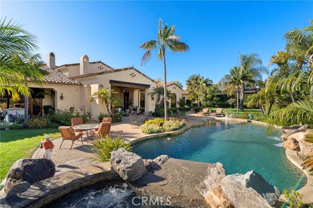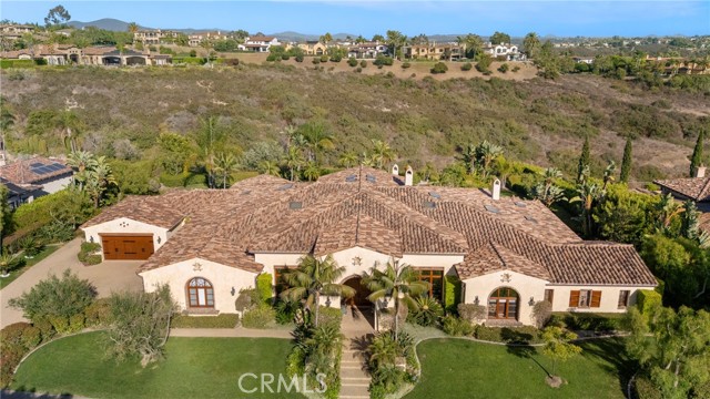 Lease Option Available or $32,000 Monthly Yr Lease. Gorgeous single level home in beautiful Rancho Pacifica. This beautifully maintained one story home is absolutely stunning. From the moment that you step into this home you will feel as though you are entering into a gorgeous Villa. The entryway is inviting and ornate with handcrafted designed iron and an ornate arched doorway. There is over $350,000 in woodwork in this pristine home that boasts high vaulted ceilings with skylights and handcrafted beams. The woodwork is handcrafted in walnut and is gorgeous and robust and surrounds the home in an handcrafted, artisan ambience. As you enter into the home there is a spacious office that has custom walnut shelves. There is a welcoming formal dining room that has an ornate ceiling and iron chandelier. There is an expansive family room that has a grand fireplace and handcrafted shelves that are beaming with a high level of aesthetic harmony. The room has immense glass sliding doors that open up to an alluring patio that has a fireplace, sink and refrigerator. It boasts a fantastic view of the gorgeous, sparkling beach style pool and jacuzzi that has a pebbled bottom and two overflowing waterfalls. There is also a media room with a theatre screen that comes down when your family is ready for that special movie night. There is a palatial primary bedroom that has a gorgeous fireplace, surround sound, high ceilings and coffee bar that leads into an expansive bathroom with a shower, sunken tub, bidet, and two expansive closets. This room has a view of the pool area and is enhanced with built-in handcrafted shelves. Down the hall is another generous-sized room with an ensuite full bath and walk-in closet. There are two other spacious bedrooms with ensuite bathrooms and showers. The kitchen has a large dining nook and a beautifully immense granite island with a separate sink, eating area with barstools, and warming drawer. Additionally, there are two dishwashers, a 72" inch SubZero with custom wood doors, wine cellar closet, roomy walk-in pantry, Viking Double Oven, Viking six burner cooktop, and trash compactor. There is a lofty laundry room down the hall and two separate car garages, one with three parking areas and one with two. There is immense space to house your cars. There is too much to mention and this home is a one-of-a-kind. A rare find single story on an enormous lot in a 24/7 guard secured neighborhood with top-rated schools and premier neighborhood.