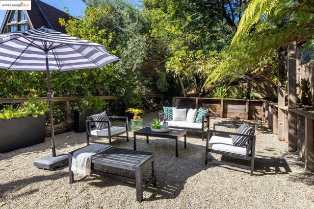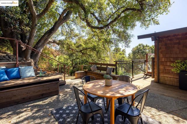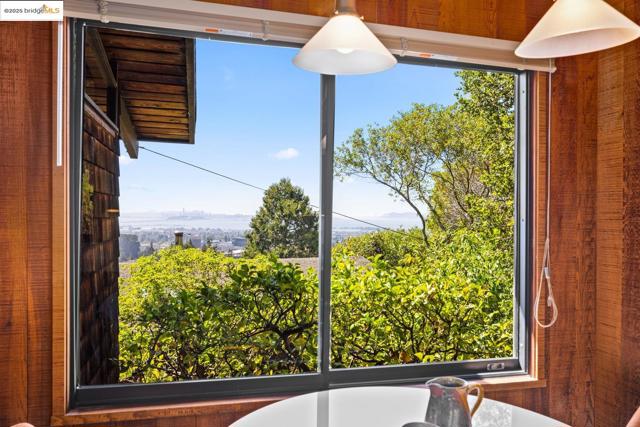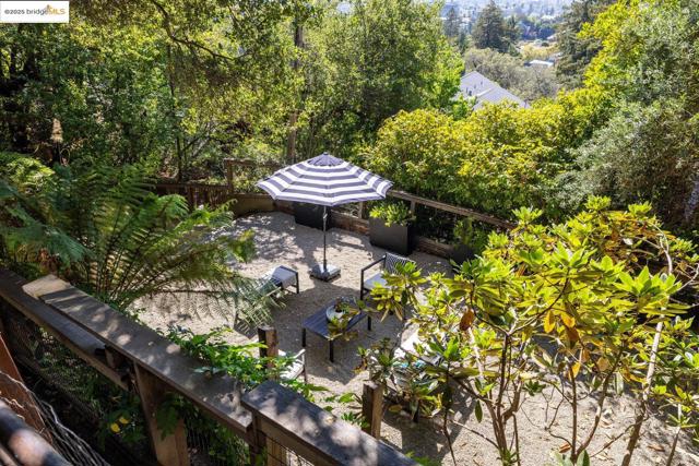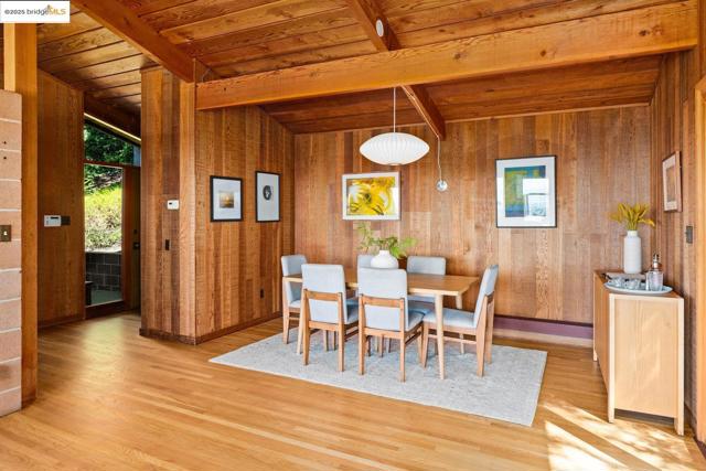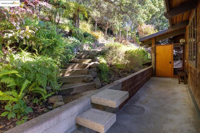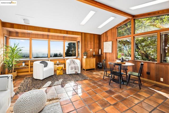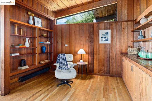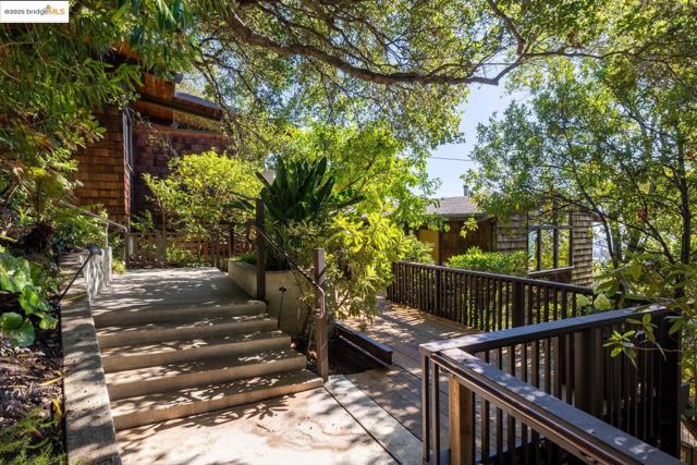 Designed by renowned Bay Area architects Robert Ratcliff and associates, this mid-century residence was envisioned to frame the dramatic natural beauty of Berkeley. Expansive west-facing windows and tiered decks showcase views of the nearby UC Camponile, the Bay, San Francisco, the Golden Gate, and the Marin Headlands, infusing the home with light and ever-changing sunsets. Inside, the architecture is defined by redwood vaulted beam ceilings, rough-sawn cedar paneling, and angular, elongated windows, which channel the era’s hallmark simplicity and warm artistry. Thoughtful craftsmanship throughout features a copper-hooded gas fireplace anchoring the living room, and a custom stained-glass door commissioned from a local Berkeley artist. The home’s generous floor plan offers 3 bedrooms, 2 full bathrooms, 2 half bathrooms, with a home office suite with its own bath and laundry, a wine cellar, and bonus spaces designed for both creativity and entertaining. A 1980s addition introduced a flexible wing with a family room/ office with a wet bar, separate entrance, and a professional darkroom, workshop, and an excess of storage, enhancing the home’s versatility for modern living. Outdoors, the property unfolds across more than 11,000 sq ft of gardens, patios, decks, and a hot tub