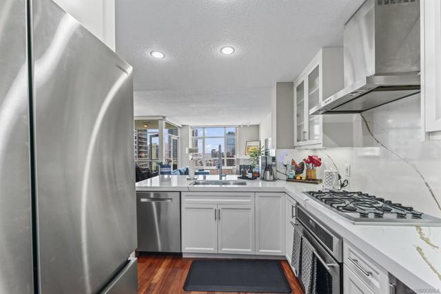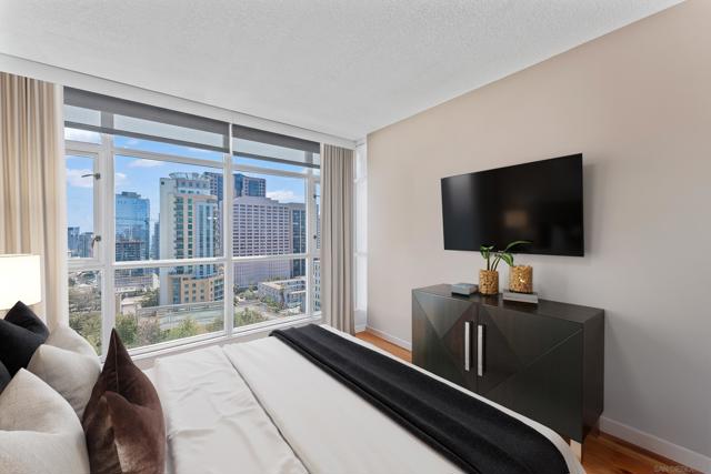 Luxury Live Auction! Bidding to start from $599,000. This is a traditional, non-distressed property. Financing or cash welcome. Seller will also review offers made before the auction date. Ultimate Lock & Leave Lifestyle! Sky-high style in Cortez Hill with views including the iconic Coronado Bridge from every room in Discovery Cortez Hill! Over $70K in upgrades! Complete kitchen remodel with quartz countertop, waterfall siding, new appliances, stainless chef faucet and shaker cabinets with bevel glass facings and a huge pantry. This unit sits on the 15th floor with 180° views to the south and west and north including San Diego harbor. Updated hall bathroom with quartz floors, new faucets, shower seat, overhead and wand faucets in oversized shower. A new stackable LG washer and dryer in a hallway closet. Primary bedroom features a walk in closet. New modern-electric remote controlled sheer blinds throughout with blackout option in bedrooms. Plenty of storage including 2 side by side elevator close parking spaces! 85sf patio with stunning views! Discovery is arguably one of the most luxurious buildings in Cortez Hill with 24 hour front desk and 10th floor pool, jacuzzi, steam, sauna and gyms. The 2nd floor has a business center and outdoor area plus an on-site building manager and extra private storage! FHA and VA approved. Easy freeway access and close to all downtown has to offer!