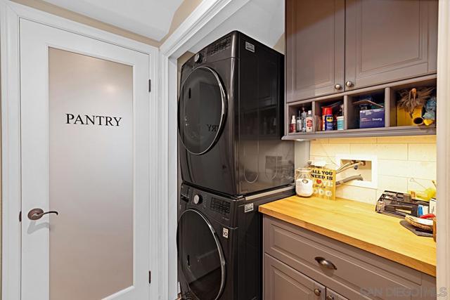 Experience the ultimate in luxury and convenience encompassing this extensively renovated, turnkey residence in the beautifully maintained, gated Bungalows at Escala community. This rarely available 3 bedroom, 2.5 bathroom open floorplan lives like a single-family home, offering privacy and serenity in a centrally located San Diego neighborhood just minutes from all San Diego has to offer. Enjoy gardening or relaxing in your private fully gated backyard with no homes behind you, surrounded by mature landscaping and peaceful panoramic hillside views. Interior highlights include a new kitchen with high end KitchenAid appliances, a built-in under counter microwave oven drawer, a large kitchen island, under cabinet lighting, lighted soft close cabinet drawers, and quartz countertops. A large walk-in pantry and a new full size stacked LG washer and dryer with built-in cabinets and a butcher block folding countertop create extra storage. Stunning wide plank, wire brushed French Oak flooring installed throughout the home with matching custom built wood stairs and handrails. Warm yourself by the oversized fireplace flanked with a wood mantle, wood shelving and rustic split limestone facing. The spacious primary bedroom features a new bathroom with a large walk-in tiled shower, three shower heads, built-in bench seat, a free standing soaking tub, and a concrete surface double sink vanity. Hand troweled walls and ceilings, and recessed lighting on dimmer switches throughout. 3rd bedroom currently showcased as a lighted walk in closet, easily returned to 3rd bedroom use if desired.