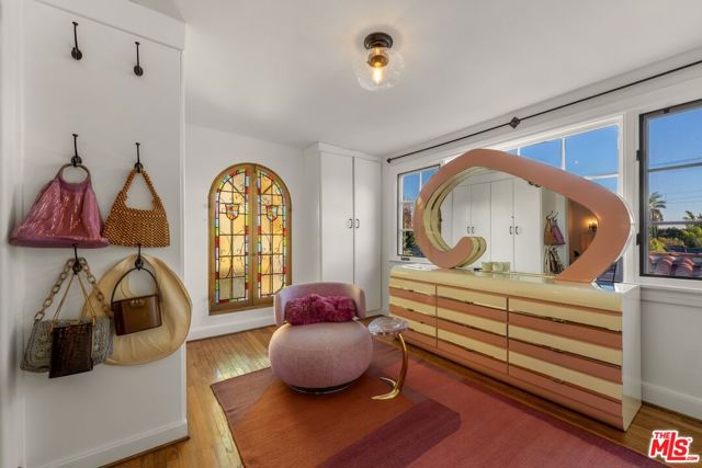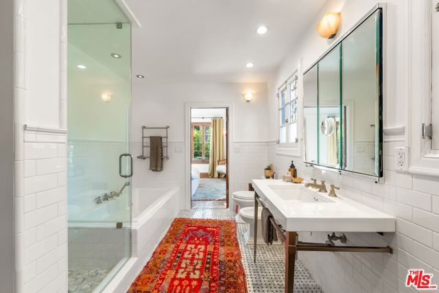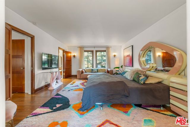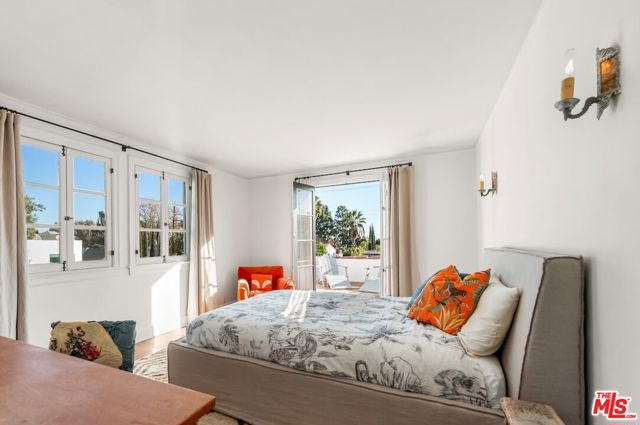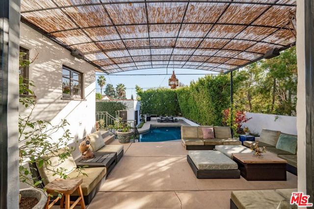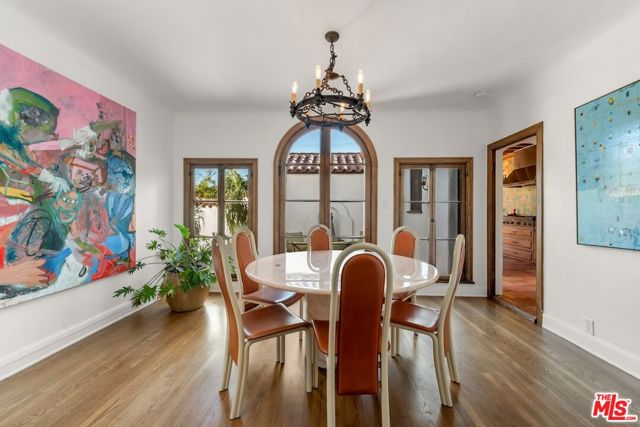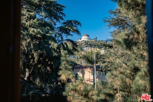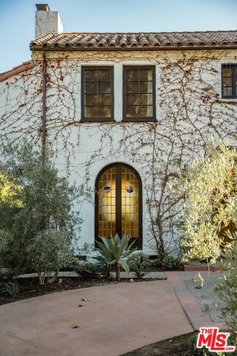 A delightful and artistic c. 1925 Mediterranean in Los Feliz, recently updated by its current owner. A circular driveway frames this stately residence draped in ivy and with glowing stained glass windows -- a rare architectural jewel where romance and old world charm meet. Historical pedigree throughout the home starts in the formal entry, with a rare colored magnesite foyer and staircase set below archways and vintage chandeliers and sconces. An oversized formal living room and dining room provide wonderful spaces for entertaining and showcasing large format art collections. Across the foyer is a cozy den with fireplace, plus breakfast room with French doors opening to a walled courtyard. The colorful tiled galley-style kitchen with exposed wood beam ceiling opens to the backyard, with adjacent laundry area and home office nearby. Upstairs, four comfortable corner bedrooms provide space for the whole family. Primary suite features a dressing area and full bathroom with shower and soaking tub. The romantic backyard is a retreat to gather and host all year round with a large terrace off the dining room, and additional seating, dining, and lounge areas dotting the grassy yard and surrounding the sparkling pool. The upgraded guest house now offers kitchenette, full bath, living area, and an oversized bedroom, perfect as a creative at-home space or for long term visitors. A classic Los Feliz home, for those who cherish a home replete with architecture transporting you to a different time. Views to the Observatory give you a sense of place within this fabulous neighborhood - blocks from Griffith Park trailheads and Los Feliz Village.