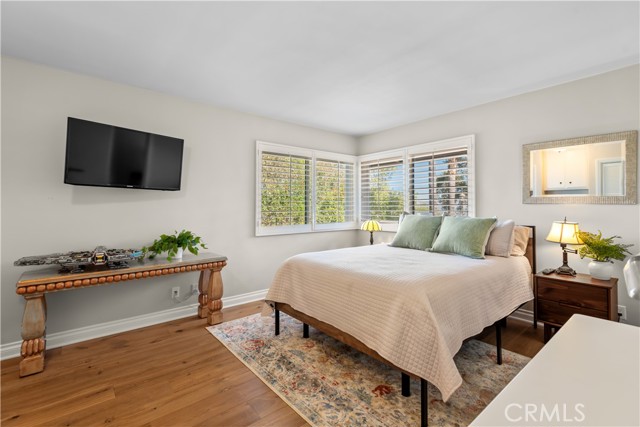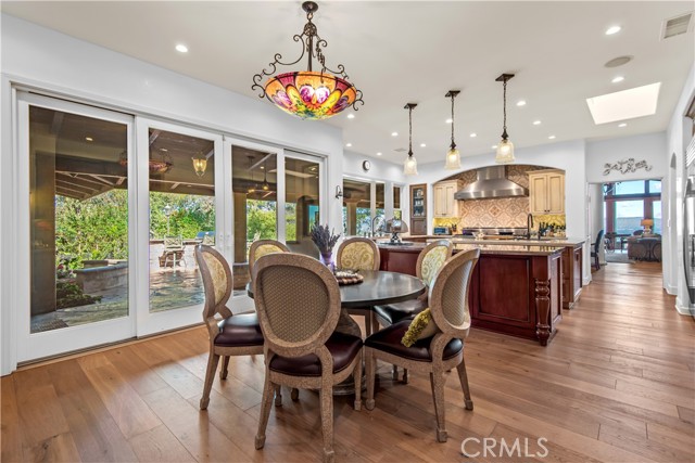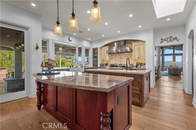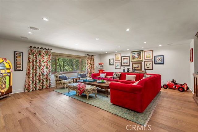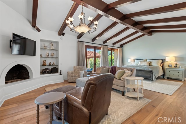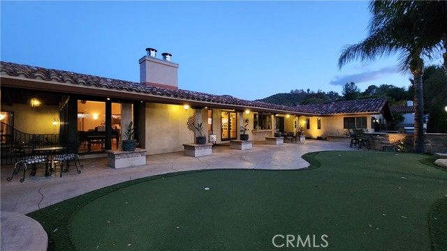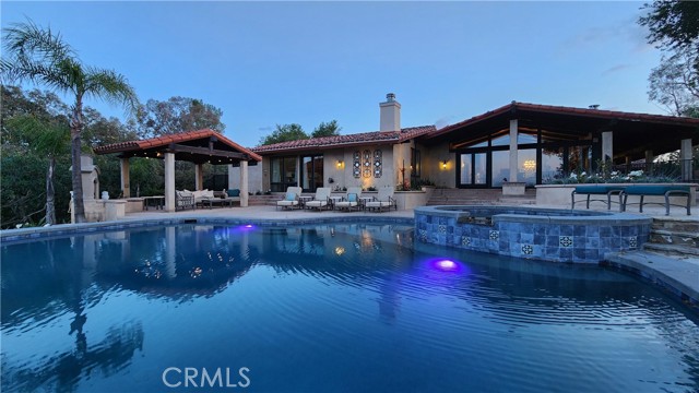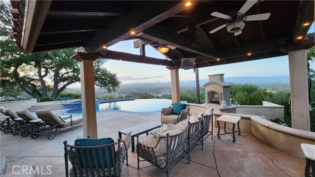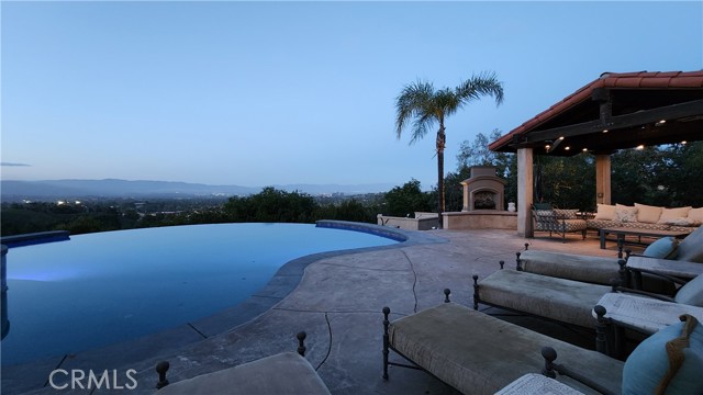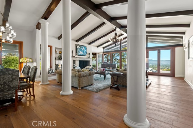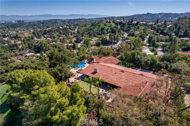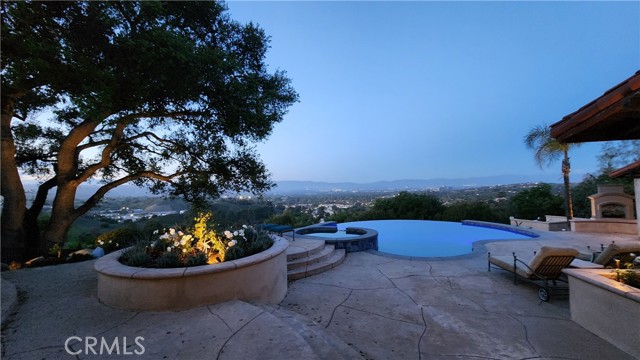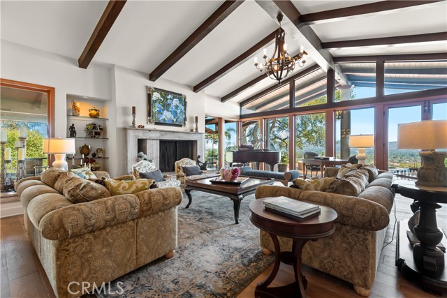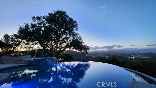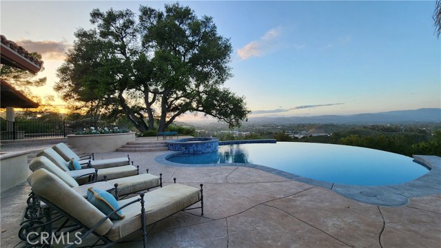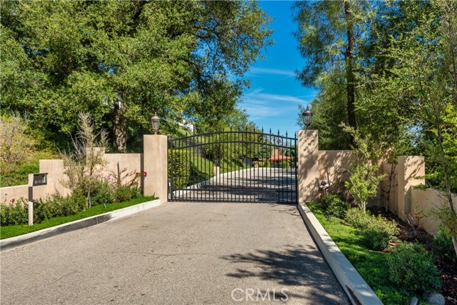 A very rare find! First time on the market in 24 years, this privately gated, nicely upgraded one-story home features panoramic views and a big private lot. Amenities include a spacious chef's kitchen with two islands, freestanding Viking Range and a sunny breakfast room, plus a large great room with vaulted, open beam ceilings, stone fireplace, & walls of glass capturing the expansive views, with an adjoining, open dining room for casual entertaining, and two private offices. The big primary suite includes a fireplace, stone bath with walk-in shower & soaking tub, dual vanities, and a large walk-in closet. There is also an adjoining room (second office) that could be an additional large walk-in closet if desired. Additional amenities include wood floors, stone countertops and big picture windows that fill the home with natural light. The lushly landscaped grounds include a superb, just remodeled, infinity edge swimmers pool with spa, two covered patios, full barbecue center with refrigerator, stone countertops & seating, outdoor fireplace, and beautiful mature oak trees. With a prime location near several public and private schools, just minutes from Calabasas Park Lake and The Commons shopping center, this custom home has much to offer.