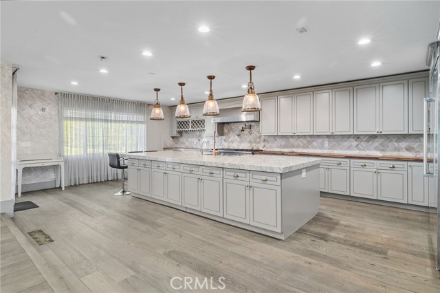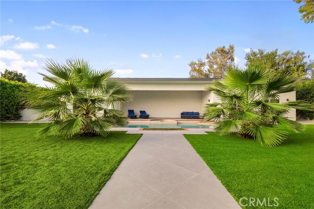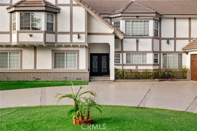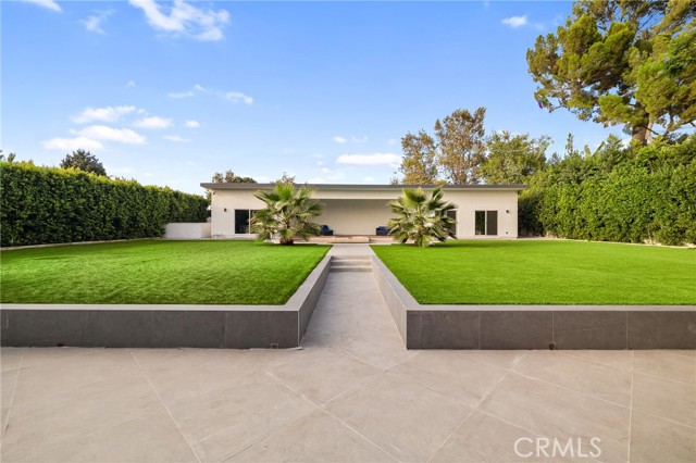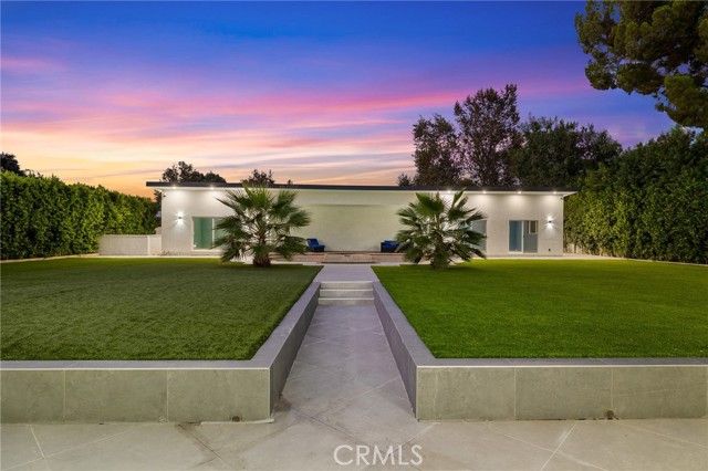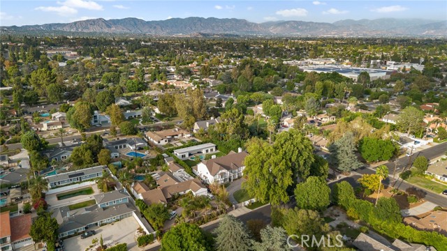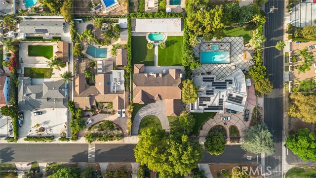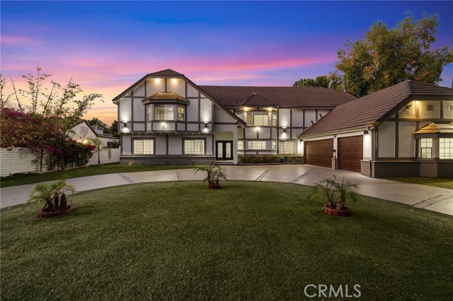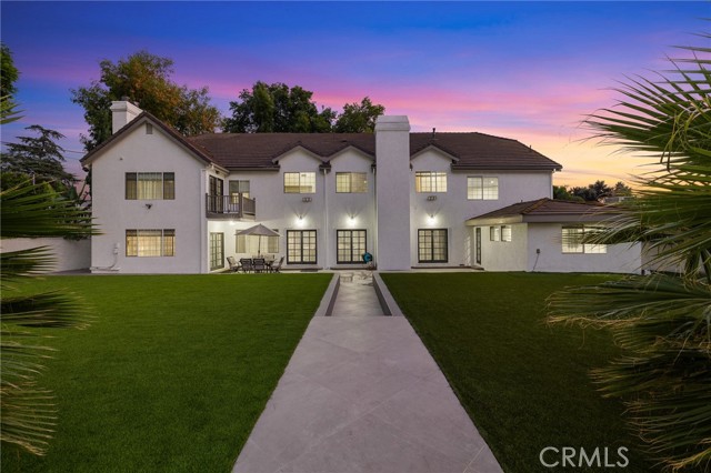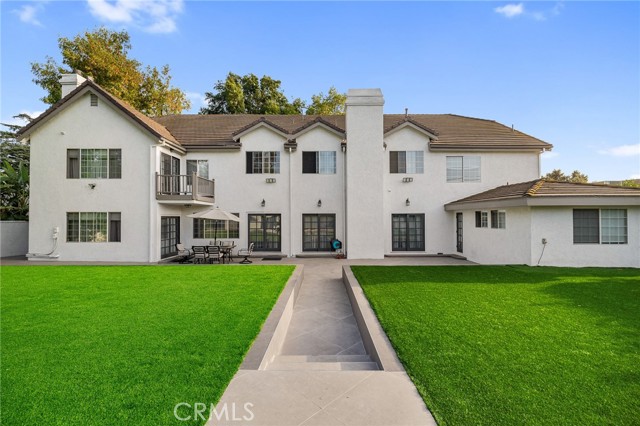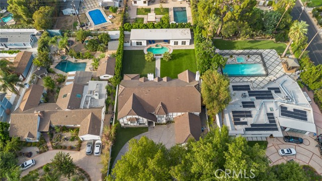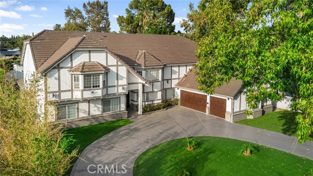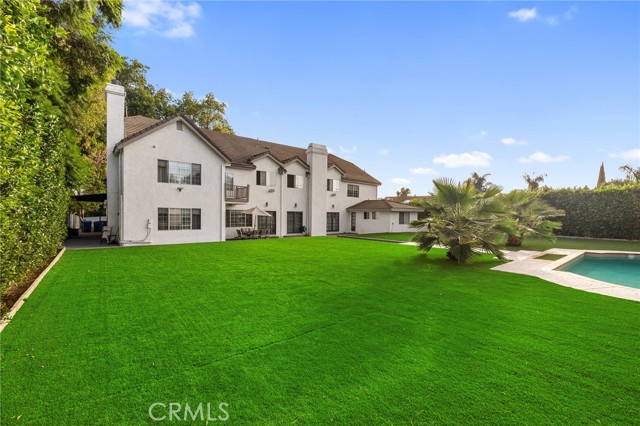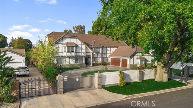 Welcome to this elegantly remodeled estate in the highly desirable community of Sherwood Forest, one of the largest homes in the neighborhood. This 7,007 square foot residence is situated on a rare 21,000 square foot lot. As you enter through the automatic gates, you are greeted by an expansive circular driveway and this modern contemporary Tudor home. The wrought iron double entry glass doors welcome you into a vast open floor plan that includes a grand family room, a sitting foyer, a formal dining room, and a remodeled kitchen. The eye-catching, upgraded oversized kitchen island, complete with custom built-in drawers and a breakfast bar, invites you into a chef's kitchen. All stainless steel appliances and custom cabinetry, accented with brass hardware, enhance your cooking experience. This bright open space is perfect for entertaining and welcoming families. The main floor's west wing features a spacious and desirable first-floor bedroom suite with a walk-in closet and private bath, along with one of two laundry areas. The east wing boasts a beautifully remodeled powder room and guest quarters, complete with a bedroom, a private bath, and an additional room with custom built-in cabinets, ideal for an in-home office or gym. The luxurious double-wide staircase leads you to a total of five upper bedrooms. Two spacious bedrooms are located in the upper east wing, accompanied by a remodeled bathroom in the common area. Two additional bedrooms with a Jack and Jill bathroom and vaulted ceilings are situated in the upper middle area, leaving the entire upper west wing dedicated to the primary suite. The primary suite features high vaulted ceilings, perfect for the elegant chandelier that greets you at the double door entrance. Custom built-ins, a retreat area with a fireplace, and a balcony create a cozy atmosphere within this expansive wing. As you enter the barn door-enclosed bathroom, relax in the glass-enclosed mosaic-tiled walk-in shower, complete with multiple shower heads and jets. Alternatively, find sanctuary in the Roman bathtub, perfect for soaking. A specially designed, automatically lit massive walk-in closet offers ample space for clothing, shoes, and accessories. The backyard is an entertainer's dream, featuring a sprawling turfed lawn that leads to a pool, tiled flooring, and lush landscaping. An additional value-added ADU with 1 bedroom and 1 bathroom-17155 Rayen, aprox. add. 800 sq ft offers its own address, making it perfect for in-laws.