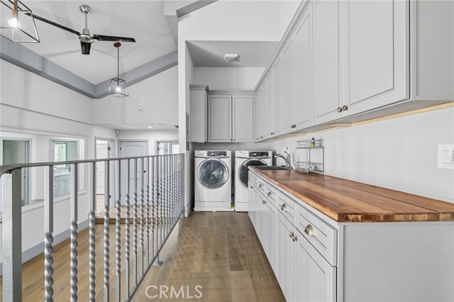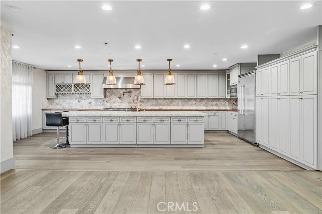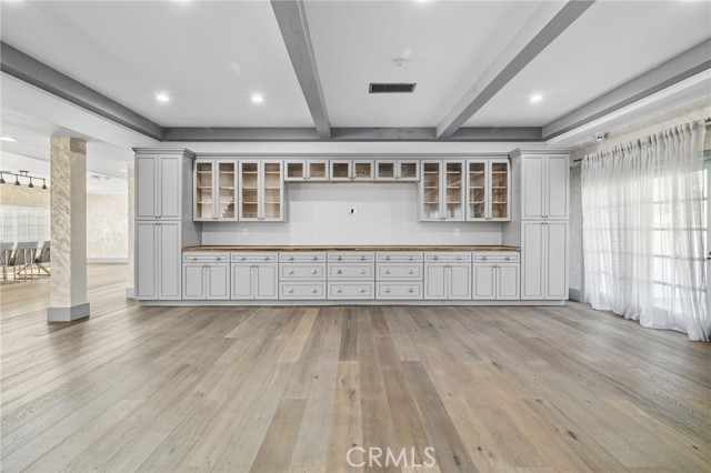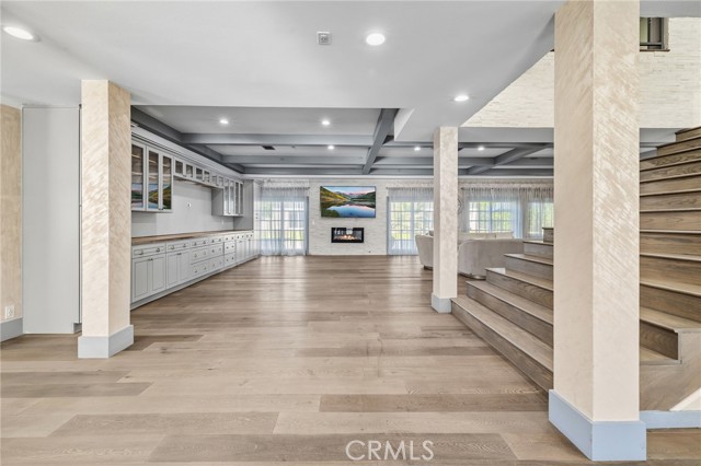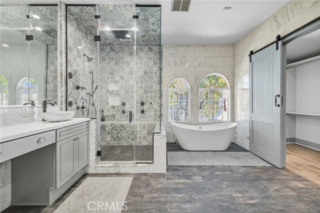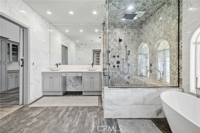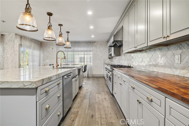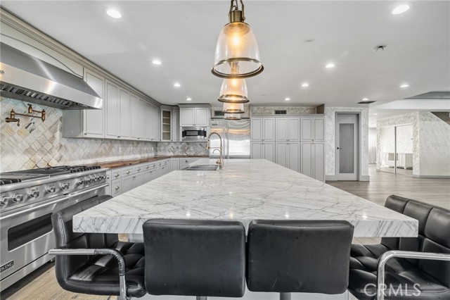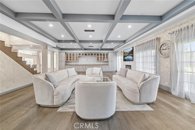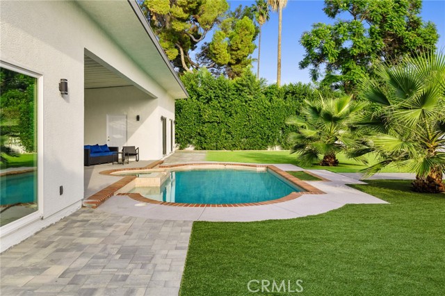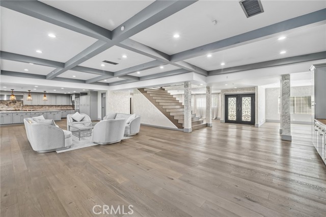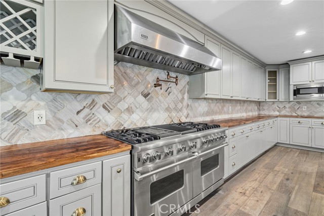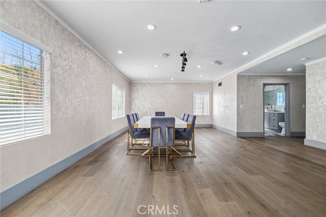 Welcome to this elegantly remodeled estate in the highly desirable community of Sherwood Forest, one of the largest homes in the neighborhood. This 7,007 square foot residence is situated on a rare 21,000 square foot lot. As you enter through the automatic gates, you are greeted by an expansive circular driveway and this modern contemporary Tudor home. The wrought iron double entry glass doors welcome you into a vast open floor plan that includes a grand family room, a sitting foyer, a formal dining room, and a remodeled kitchen. The eye-catching, upgraded oversized kitchen island, complete with custom built-in drawers and a breakfast bar, invites you into a chef's kitchen. All stainless steel appliances and custom cabinetry, accented with brass hardware, enhance your cooking experience. This bright open space is perfect for entertaining and welcoming families. The main floor's west wing features a spacious and desirable first-floor bedroom suite with a walk-in closet and private bath, along with one of two laundry areas. The east wing boasts a beautifully remodeled powder room and guest quarters, complete with a bedroom, a private bath, and an additional room with custom built-in cabinets, ideal for an in-home office or gym. The luxurious double-wide staircase leads you to a total of five upper bedrooms. Two spacious bedrooms are located in the upper east wing, accompanied by a remodeled bathroom in the common area. Two additional bedrooms with a Jack and Jill bathroom and vaulted ceilings are situated in the upper middle area, leaving the entire upper west wing dedicated to the primary suite. The primary suite features high vaulted ceilings, perfect for the elegant chandelier that greets you at the double door entrance. Custom built-ins, a retreat area with a fireplace, and a balcony create a cozy atmosphere within this expansive wing. As you enter the barn door-enclosed bathroom, relax in the glass-enclosed mosaic-tiled walk-in shower, complete with multiple shower heads and jets. Alternatively, find sanctuary in the Roman bathtub, perfect for soaking. A specially designed, automatically lit massive walk-in closet offers ample space for clothing, shoes, and accessories. The backyard is an entertainer's dream, featuring a sprawling turfed lawn that leads to a pool, tiled flooring, and lush landscaping. An additional value-added ADU with 1 bedroom and 1 bathroom-17155 Rayen, aprox. add. 800 sq ft offers its own address, making it perfect for in-laws.