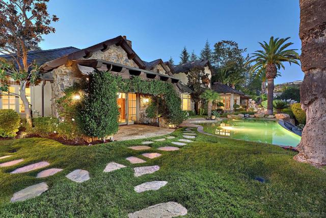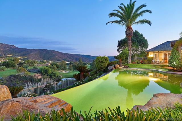 An Iconic French Country Estate in The Heritage Set within the gate-guarded, exclusive community of The Heritage, this Greg Agee French Country masterpiece claims a premier position on over an acre along the second hole of the world-class Maderas Golf Club. Spanning more than 7,800 square feet, this estate blends timeless architectural integrity with resort-inspired living, all framed by immersive panoramic views. A dramatic entry crowned with a dazzling chandelier welcomes you into interiors of refined sophistication—soaring ceilings, freshly refinished hardwood floors, custom millwork, and wainscoting throughout. The great room commands attention with its grand masonry fireplace, vaulted wood-beamed ceilings, and seamless flow into the heart of the home. The gourmet kitchen is a chef’s statement, boasting dual Sub-Zeros, a Viking 6-burner range with flat grill, dual Bosch dishwashers, custom alder cabinetry, and a sunlit dining area with golf course views. Formal and casual spaces—from the elegant dining room to the inviting bar—set the stage for effortless entertaining. Designed to live primarily as a single level, the residence offers a serene ground-floor primary suite with dual walk-in closets, dual water closets, and spa-inspired vanities. A handsome office, an additional ensuite bedroom on the main level, with three upper ensuite retreats ensure comfort for all. A detached one-bedroom casita adds privacy and resort style living for extended guests. Outdoors, the home transforms into a private resort: a vanishing-edge pool spilling toward the fairways. Set on a highly desirable street within the Heritage. Outdoors, the home transforms into a private resort: a vanishing-edge pool spilling toward the fairways, a dramatic waterfall spa, and a fully equipped outdoor kitchen and dining pavilion—all capturing the breathtaking backdrop of Maderas’ rolling fairways. A detailed authentic custom slate roof, motor court with 4 car garage. This estate is more than a residence; it is a legacy of artistry, elegance, and exclusivity—standing proudly among the most distinguished properties within The Heritage.