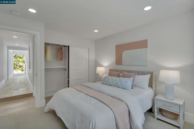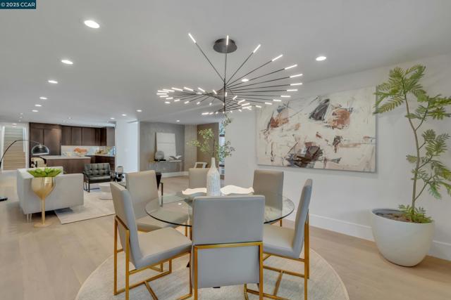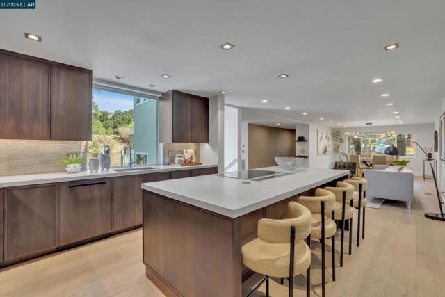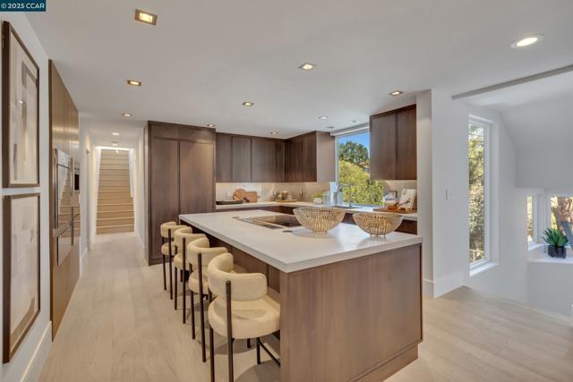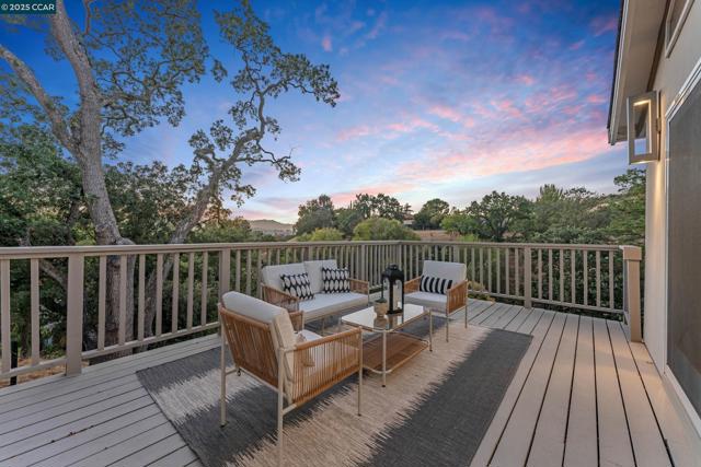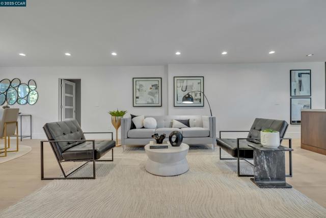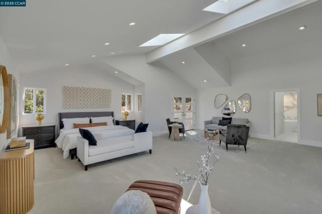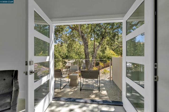 Welcome to 127 Caminar Way – a private, Hollywood Hills-style estate in the hills of Walnut Creek, where luxury, views, and nature come together. This modern residence features smart-home tech, high-end finishes, and an open-concept main level with a sleek kitchen, custom cabinetry, Miele appliances, pantry, and light-filled dining/family areas. Also on this level: a chic powder room and ensuite bedroom. Upstairs offers a dramatic great room with vaulted ceilings, fireplace, kitchenette, and expansive view deck. The Zen-inspired garden includes lush landscaping and a fire pit. The grand primary suite features soaring ceilings, modern fireplace, spa-like bath, walk-in closet, and private balcony. Two additional bedrooms and a hall bath complete the upper floor. Upgrades include new roof, Level 5 smooth walls, American oak floors, designer lighting, skylights, and 3-zone HVAC. Exterior highlights: resurfaced pool, full pool bath, active beehives, and space for sport or pickleball court. The ADU includes a private entrance, full kitchen, 1 bed/1 bath, vaulted ceilings, hardwood floors, and view balcony. A rare opportunity for privacy, elegance, and indoor/outdoor living. Views: Downtown
