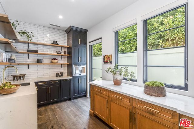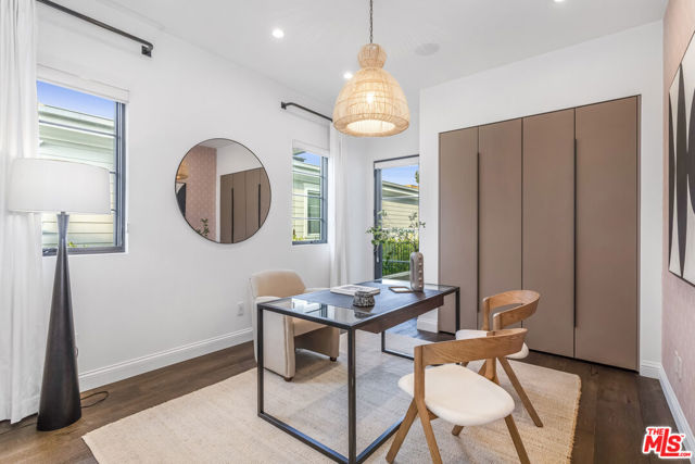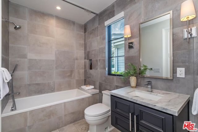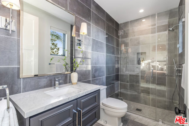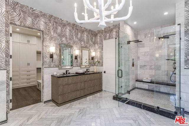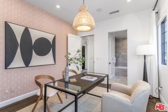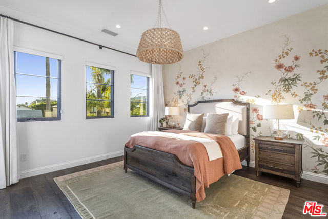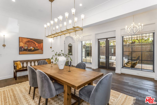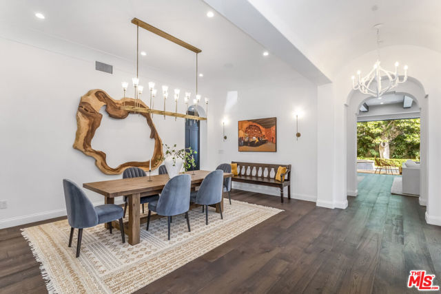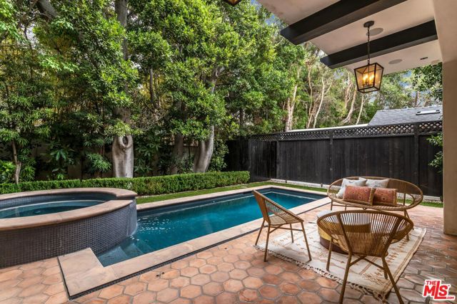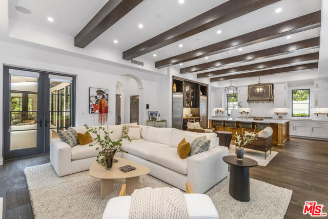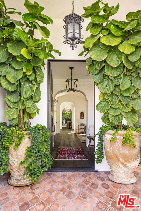 This resort-quality Spanish Revival home is a rare opportunity, blending timeless elegance with modern livability. Fully gated and exceptionally private, the residence is framed by mature palms, lush landscaping, and multiple courtyards, patios, and terraces that create the quintessential California indoor-outdoor lifestyle. Inside, the architecture exudes character with graceful archways, wood-beamed ceilings, and charming wrought iron and tile finishes. The layout is designed for intimate gatherings yet equally suited to large-scale entertaining, with the living, dining, and family rooms wrapping around a tiled interior courtyard with fire pit. Outdoors, a sliding wall of Fleetwood doors connects the home to a private pool, spa, and BBQ area, all surrounded by mature trees and landscaping. The chef's kitchen and primary bath are showcases of custom quality and understated elegance, while a large butler's pantry provides added convenience. Every upstairs bedroom opens to its own terrace, and the thoughtful design continues with a 500 sq. ft. roof deck featuring a built-in wet bar and sweeping 360-degree views of all of Los Angeles. There is simply nothing else on the market with this level of detail, design, and sophistication, while central to the best of West Hollywood and Beverly Hills.