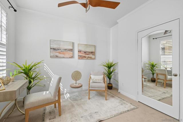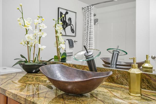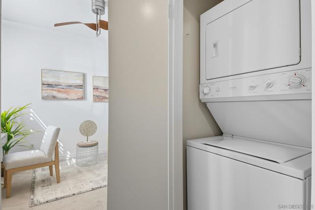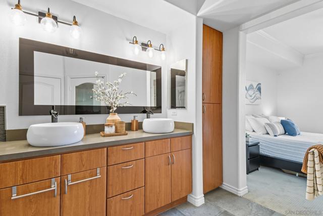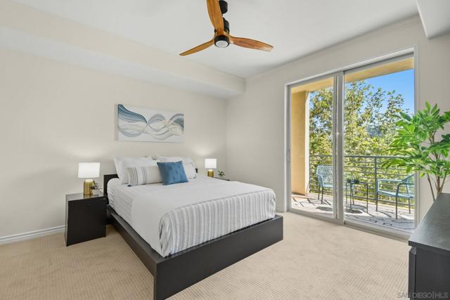 Welcome to The Lido in Mission Valley, where resort-style living meets everyday convenience. This rarely available top-floor residence combines southern exposure, sweeping views, and an open layout that begins with a formal rotunda entry leading to a spacious kitchen with a large island flowing seamlessly into the dining and living areas, accented by hardwood floors that add warmth and character. Fresh paint and new bedroom carpeting enhance the bright, comfortable atmosphere throughout. The primary suite offers direct access to the covered patio along with a generous walk-in closet and a beautifully remodeled spa-like ensuite bathroom featuring dual vanities, a soaking tub, and a separate shower with custom tile accents and a shower bench. A second bedroom and full bath provide comfort and flexibility for guests, a home office, or additional living space. Other highlights include two side-by-side parking spaces and a private storage locker. The Lido provides premium amenities such as a pool, spa, large fitness center, and clubhouse. Set in a prime location above the San Diego River, the community is moments from major freeways, the trolley station, dining, shopping and recreation. Top-floor homes with this floor plan and views are seldom available.