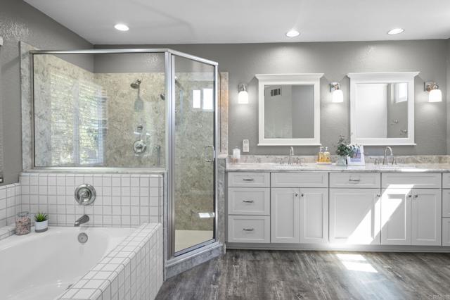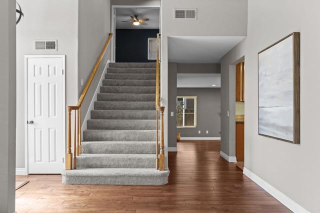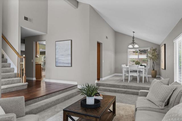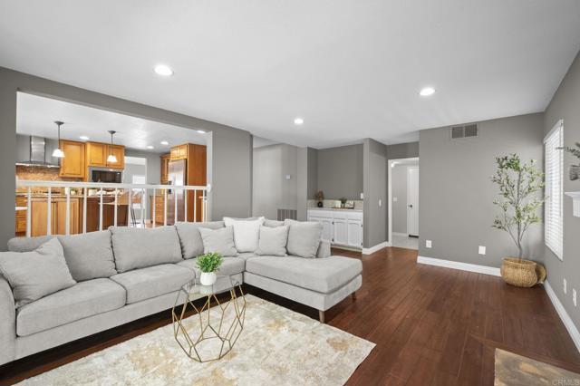 First Time on the Market! Welcome to this stunning two-story home featuring 4 bedrooms and 3 full baths, ideally located in the highly desirable community of Rancho Peñasquitos. Designed with a versatile split floor plan, this residence offers both comfort and functionality. The interior boasts engineered hardwood flooring, upgraded carpeting, and a spacious chef’s kitchen complete with a center island and stainless steel appliances. Upon entry, you’re greeted by a warm and inviting formal living and dining area, filled with natural light. The thoughtful layout includes a full bathroom on the first floor, providing convenience for guests or multi-generational living. Upstairs, you’ll find all four bedrooms, including a beautifully renovated primary suite with an oversized walk-in closet and a luxurious spa-like bathroom. The expansive backyard is perfect for entertaining or simply enjoying the cool San Diego evenings.