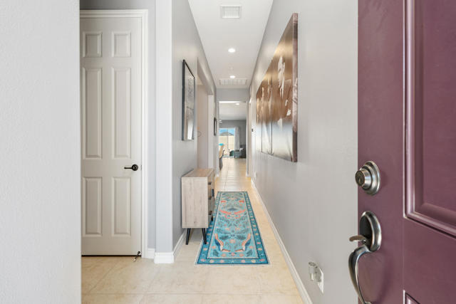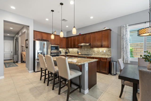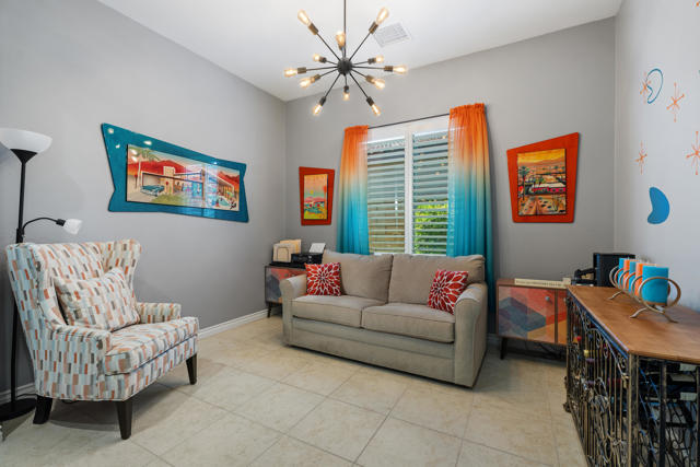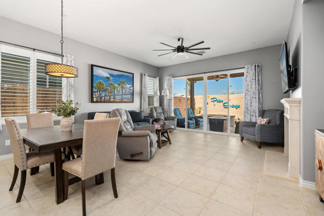 Experience resort-style living at its finest in this luxurious pool home behind the gates of the prestigious Four Seasons Terra Lago, a 55+ community where sophistication meets serenity. Step inside to discover soaring 9-ft ceilings, an open-concept layout, and breathtaking west-facing mountain views that create the perfect desert retreat. This beautiful home offers 2 bedrooms plus a spacious den/office, ideal for guests or working from home. The gourmet kitchen is a chef's dream, featuring rich dark cabinetry, granite countertops and backsplash, stainless steel appliances, double ovens, a built-in microwave, and a large island with pendant lighting. The inviting living area includes a decorative fireplace and shutters throughout for an elegant touch. Open the center-meet sliding doors to your private backyard oasis with a sparkling pool and spa, a covered alumawood patio, and stunning panoramic mountain views. Perfect for entertaining or unwinding in Palm Springs style. The primary suite offers dual vanities and an upgraded rainfall glass shower, creating a spa-like retreat. Located within the Golf Club at Terra Lago, Four Seasons offers low HOA fees and convenient access to the Lodge, freeway, casino, shopping, and entertainment. Don't miss your chance to live the ultimate desert lifestyle. Schedule your private tour today!