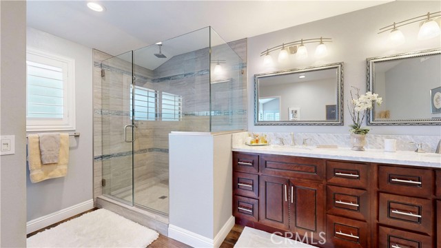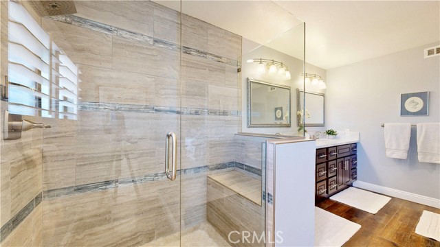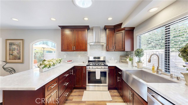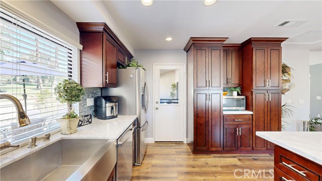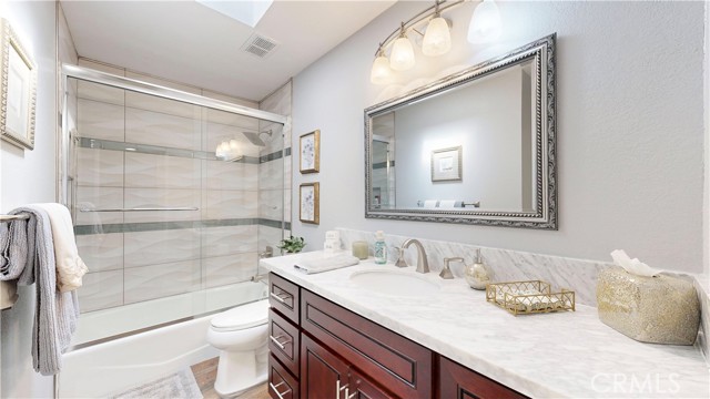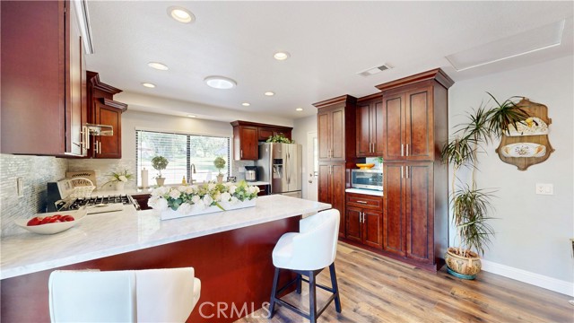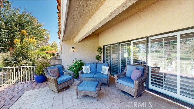 Experience refined elegance and modern sophistication in this exquisitely remodeled single-story condominium, perfectly situated within the exclusive gates of Upland Hills Country Club. From the moment you step inside, you’ll be captivated by the home’s thoughtful design, stunning finishes, and sweeping views of the lush fairways and majestic mountains beyond. The entry opens to a gallery style dining and kitchen area, beautifully enhanced with rich mocha luxury vinyl plank flooring and designer lighting. The gourmet kitchen is a true showpiece, featuring Carrera marble countertops, a farmhouse sink, stainless steel appliances, and custom chocolate mahogany cabinetry, all framed by a picturesque arched window overlooking the tranquil side patio. The grand great room impresses with soaring cathedral ceilings, a custom-built fireplace, elegant built-in cabinetry, and expansive glass doors that invite an abundance of natural light while framing breathtaking 180 degree views of the surrounding landscape. The interior showcases a refined color palette with two-tone designer grays in the living spaces and warm, inviting browns in the bedrooms, creating a perfect balance of sophistication and comfort. One of the bedrooms features dual glass barn doors that allow for versatility, open for spacious flow or closed for serene privacy. Each bathroom has been artfully reimagined with luxury in mind, highlighted by the primary suite’s spa-inspired bath featuring an oversized 6’x3’ walk-in shower with a three-way diverter, rain shower head, wave tile with titanium trim, thick custom glass enclosure, dual vanities, and a relaxing Roman tub. The primary suite itself boasts a high-pitched ceiling, large closet, and elegant window treatments for a truly restful retreat. This exceptional home offers one expansive primary suite, two additional bedrooms, a two-car garage, and two covered patios ideal for al fresco dining or quiet reflection. Few residences enjoy such a desirable location with ample outdoor space and proximity to one of the community’s serene private pools. Enjoy luxury living with the perfect blend of comfort, design, and breathtaking golf course views.