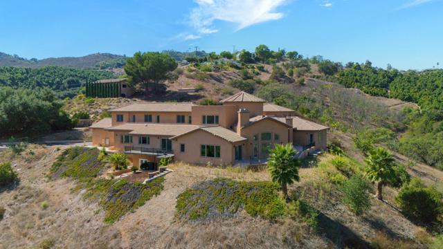 Perched on over 6 acres of rolling land, this Mediterranean-inspired estate offers sweeping valley views and a rare opportunity for elevated living. The home is beautifully framed and features dramatic vaulted ceilings, a grand rotunda entry, and finishes that reflect refined craftsmanship. Multiple fireplaces add warmth and ambiance throughout while expansive glass doors seamlessly connect indoor spaces to the natural beauty outside. The grounds are lush and private, with mature landscaping and an avocado grove that adds both tranquility and income potential. With generous driveways and parking, this residence strikes a perfect balance between peaceful seclusion and easy access to amenities. Positioned in a desirable community and built with attention to detail, this property is made for those seeking elegance and room to breathe.