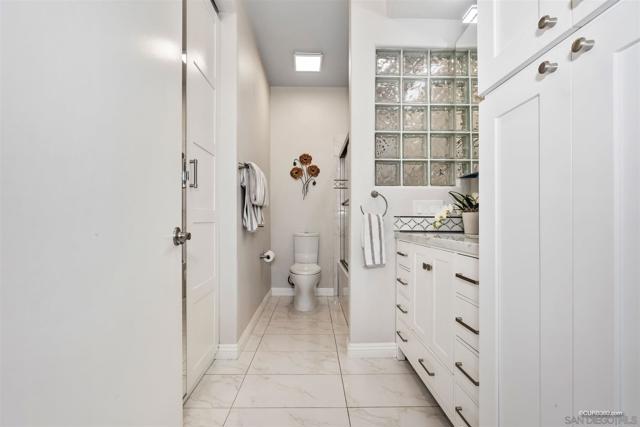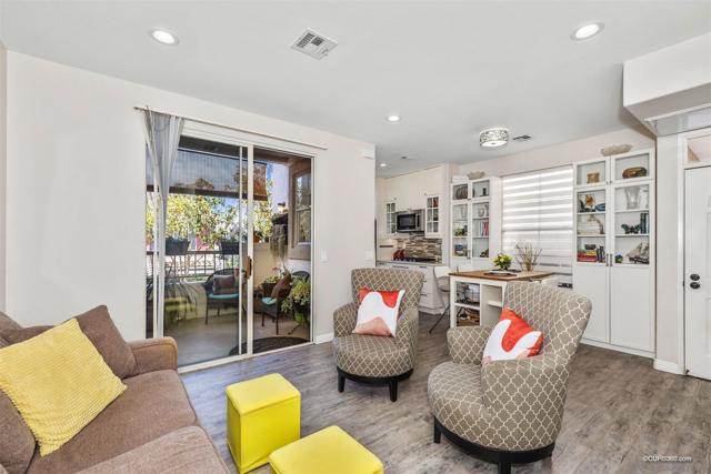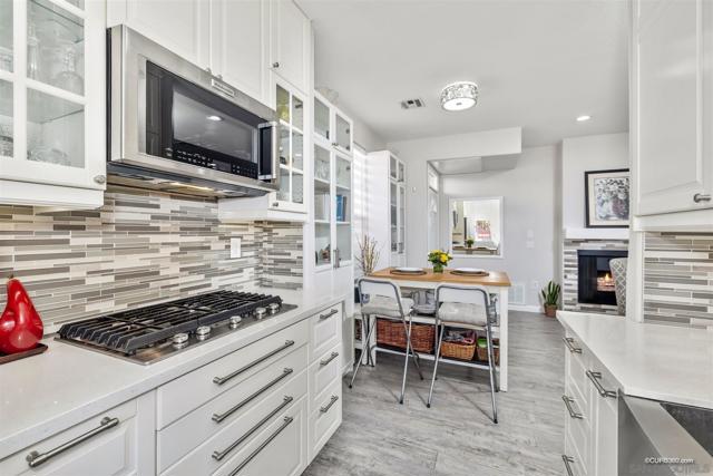Remodeled end unit with 2 bed/2bath stunning Mira Mesa condo upgraded from floor to ceiling. This beautiful residence features dual master ensures, high ceilings, 2-outdoor partios, kitchen with marble counter top, bath complete remodel with custom designed interior paint, ceiling fans, fixtures, custom window shades, custom closets and tiled showers, stainless appliances, laminate wood flooring, custom closets with LED recessed lighting. This unit is in the most desired location all the community positioned against the furthest north side of the complex and with no neighbors to the side.The unit has two underground garage spots, full size washer and dryer, fireplace.