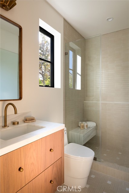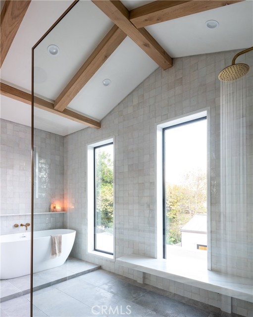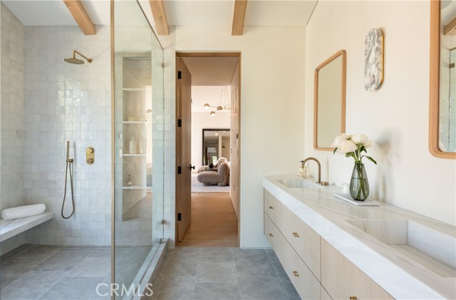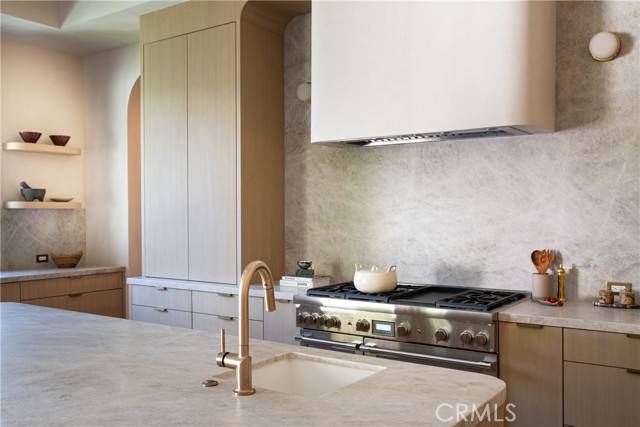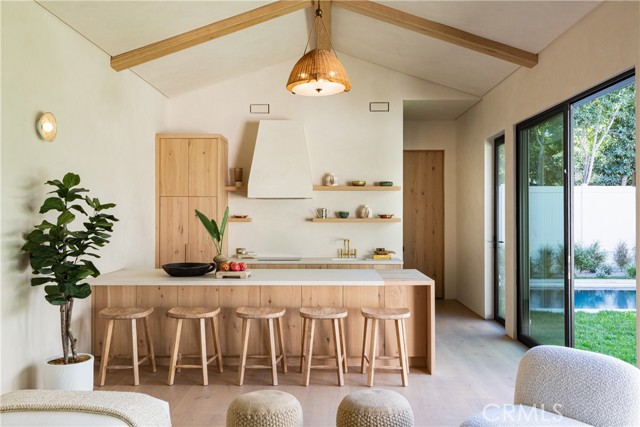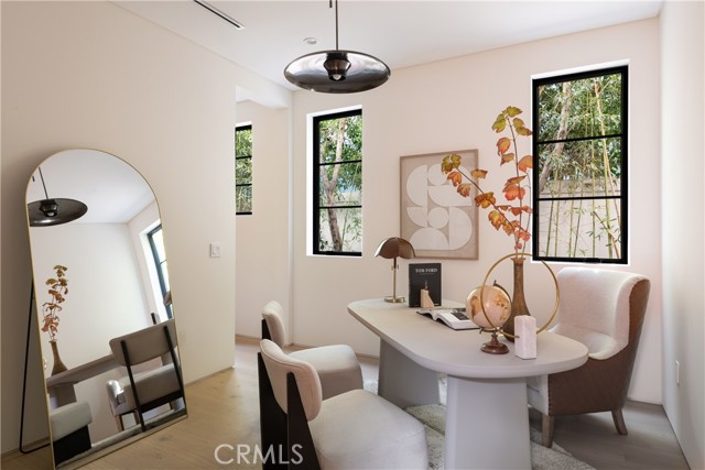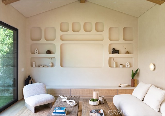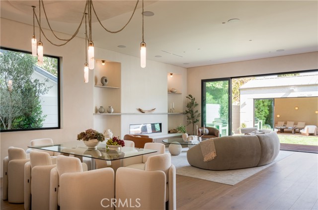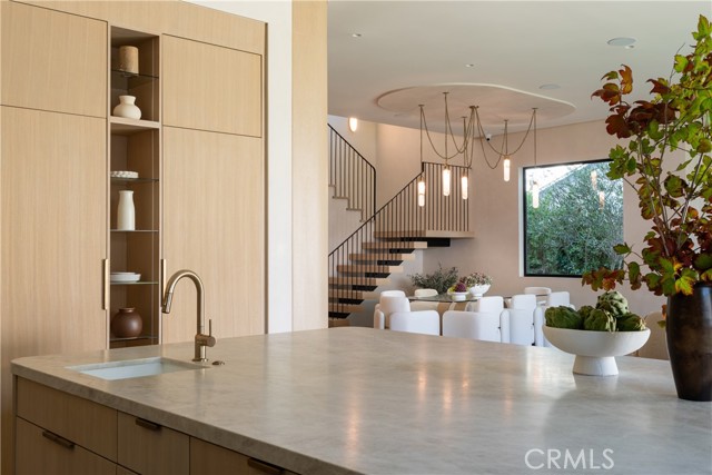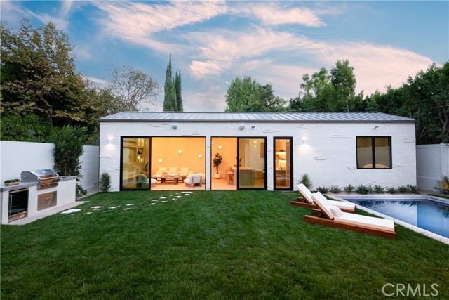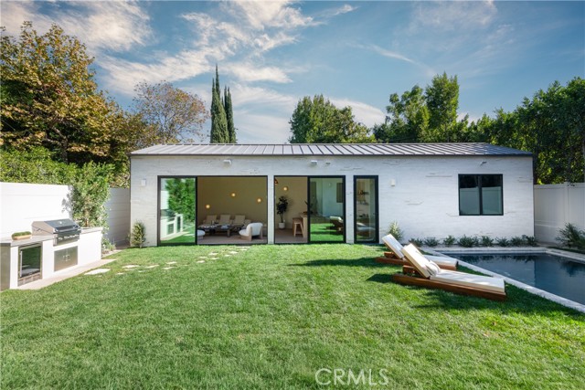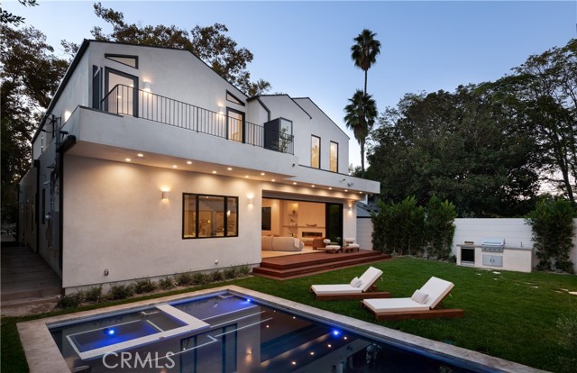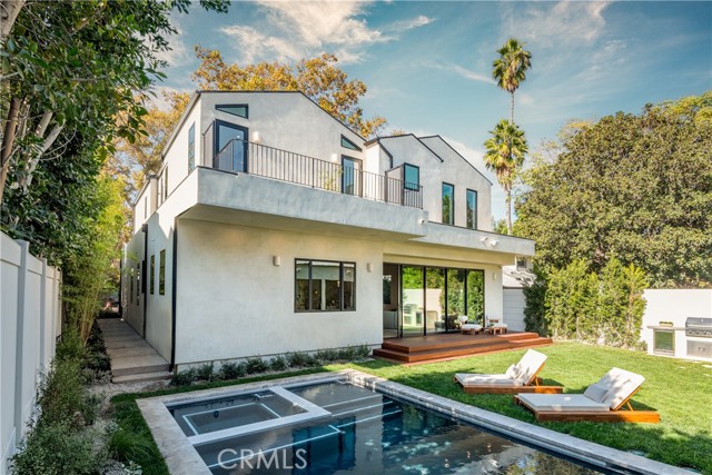 Introducing a newly built Deco Revival inspired modern estate in the heart of Sherman Oaks, ideally located South of the Boulevard and moments from top restaurants, shops, and cafés. Crafted with elevated materials and refined organic texture elements, this residence blends timeless Art Deco elegance with contemporary California living. The exterior features natural stone, brick, and smooth stucco, creating a striking architectural presence. Once inside, custom oak cabinetry, hand-crafted oak ceiling beams, and European natural stone countertops set a sophisticated tone. Upon entering, the main floor unfolds with a seamless flow through spacious, open concept living. Natural light fills the space where expansive living and dining areas flow seamlessly into the gourmet kitchen. The chef’s kitchen is equipped with premium Thermador appliances, European stone countertops, bespoke fixtures, and a large island designed for cooking, gathering, and everyday living. Curved architectural lines and thoughtful lighting, elevate the ambiance with refined soft deco influence. A desirable first-floor ensuite bedroom provides flexibility for guests or a private office, while a spacious theater offers an ultimate cinematic experience. Upstairs, there are four additional ensuite bedrooms, including a luxurious primary suite with vaulted ceilings, custom walk-in closet, private balcony overlooking the outdoors and a spa-inspired bathroom featuring premium finishes and marble countertops. Thoughtfully designed for comfort and privacy, each bedroom enjoys its own beautifully finished ensuite bathroom and custom closets. Make your way outside to the backyard oasis, offering a resort-style pool and spa, outdoor BBQ island and room for alfresco dining and entertaining. The 1 bedroom, 1 bathroom ADU is the perfect place for extended family, friends who are visiting or your home studio.
