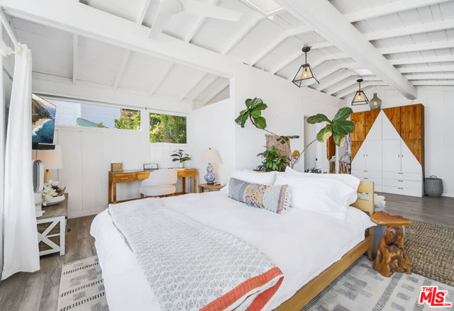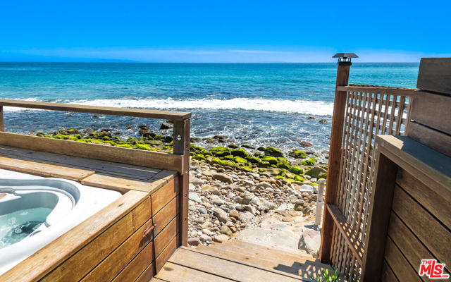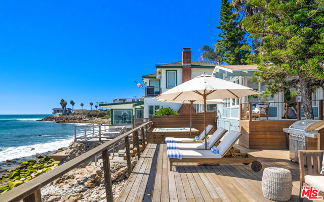 With the oceanfront atmosphere of a year-round vacation house, this charming bungalow is perfectly situated for relaxed living and entertaining. Panoramic ocean and coastline views and the ever-changing vistas of the shoreline. Located at the famous surf break on Las Flores Beach, the home has walls of glass and decks to take full advantage of the surroundings creating a natural flow between the indoors and the outdoors. The main living area is an ocean-view living/dining/kitchen space with a wall of glass doors that open to the beachfront deck. Plank ceilings, additional windows, and skylights complement the home's natural light. The kitchen features quality appliances, bar seating, and a breakfast area. The primary suite has high plank-and-beam ceilings, skylights, deck access, a sitting area, walk-in closet, tiled bath and sensational ocean views from the comfort of the bed. The additional 2 bedrooms offer chic comfort for your guests and sliding doors opening to a side yard letting in the ocean breezes. Step out your door to the oceanfront jacuzzi or lounge on the expansive oceanfront deck offering two levels creating the perfect space to entertain. On the upper level is a huge enclosed dining sunroom and an enormous lounging area partially shaded by a beautiful Norfolk pine tree. The lower deck has more space for dining, lounging, barbecue, fire pit, outdoor shower and gated steps to the shore. Some recent upgrades include new plumbing in 2023, new roof in 2024 and Lifesource Water System! Private and romantic, this is the very essence of Malibu beach living. Currently offered as a short term rental on Airbnb generating additional income as well!