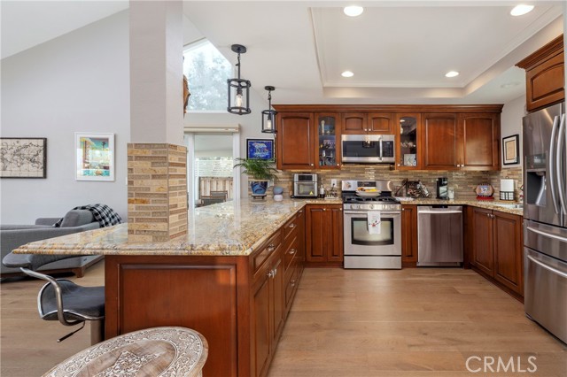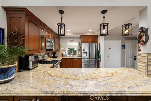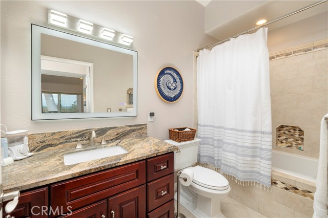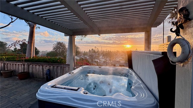 Welcome home to this beautifully updated 2-bedroom, 2-bath retreat that perfectly blends modern comfort, functionality, and coastal elegance. Step through the double-door entry into a bright, open living space featuring high ceilings, new wood flooring, and expansive glass sliders framing stunning 180° mountain and city lights views. Enjoy cozy evenings by the gas fireplace—or unwind in your private hot tub while soaking in the tranquility of this hidden oasis in the heart of Huntington Beach. The outdoor living space has been thoughtfully redesigned with elegant hardscape and newer cedar fencing, offering exceptional privacy as the home backs to a lush greenbelt filled with birds and flowers—an uncommon feature for the area. The remodeled kitchen is a chef’s dream with stainless steel appliances, granite countertops, custom soft-close cabinetry, pendant lighting, a spacious pantry, and a charming garden window. The primary suite captures sweeping views and abundant natural light, featuring a newly designed closet and a spa-like bath with a jetted tub/shower combo. Both bathrooms include skylights for a bright, airy feel. The large attached two-car garage has been fully upgraded with sealed epoxy flooring, an insulated ceiling, a new opener, a top-of-the-line gym setup, and ample shelving for storage. Additional highlights include central heat and A/C with a Nest thermostat, a tankless water heater, a new whole-home water filtration system with reverse osmosis in the kitchen, remote-controlled blinds, and all-new designer lighting throughout. The exterior includes Ring security cameras and Leaf filter rain gutters. Located in a highly desirable neighborhood with low HOA dues and accessed by private road, the community features a sparkling pool and spa, barbecue area, and meeting room, plus front yard landscape maintenance included. 3 miles to the beach and world famous HB Pier, and near top-rated restaurants, shopping, and entertainment, this move-in-ready home offers exceptional privacy, comfort, and the best of Surf City living.