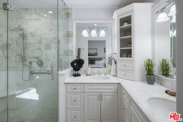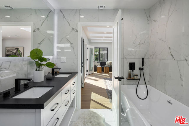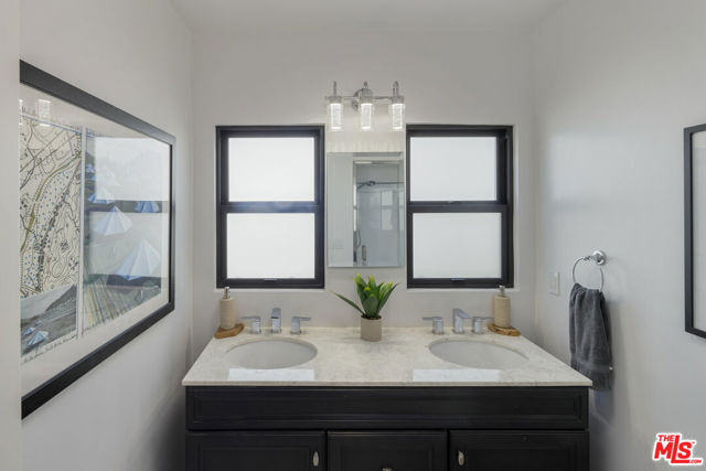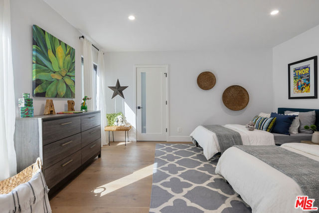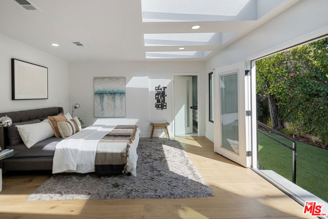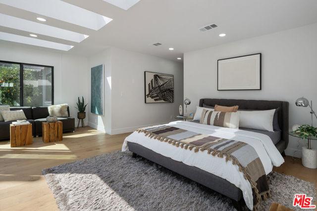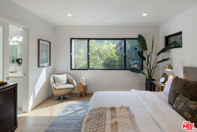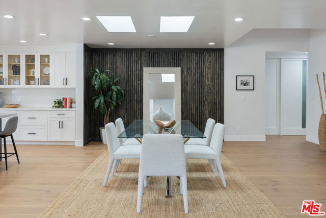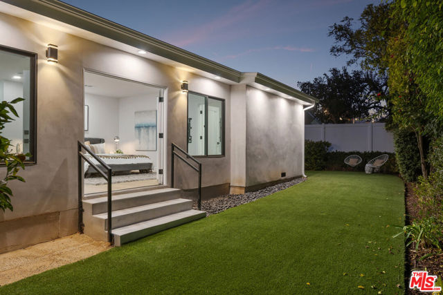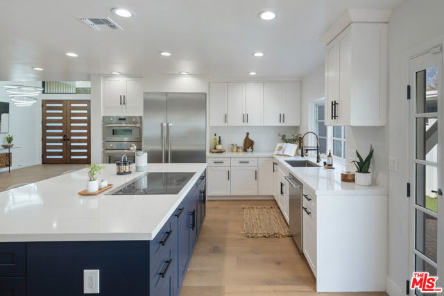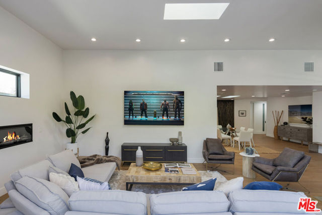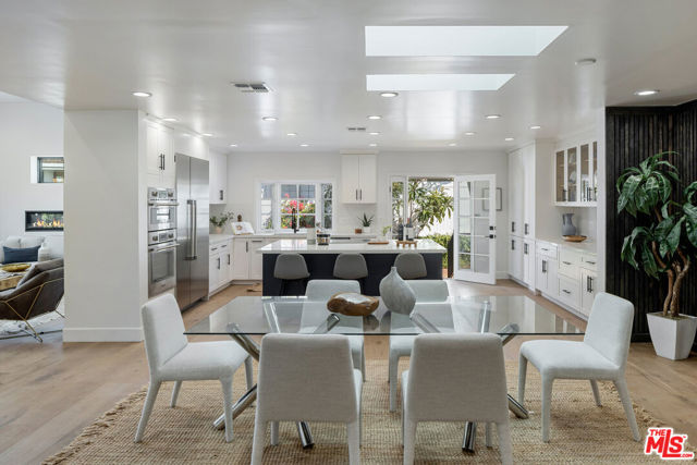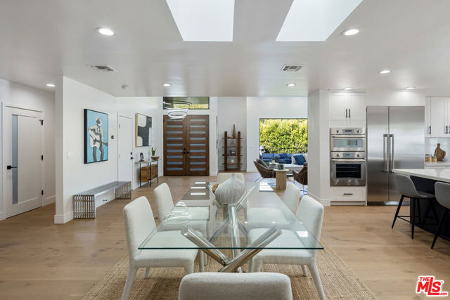 This meticulously renovated single-story, contemporary 4-bedroom, 4.5-bathroom home offers an unparalleled living experience situated in a prime location of highly desirable Brentwood (South of Sunset). An architectural modern residence that seamlessly integrates sophistication with luxury and convenience. Upon entering the home, stepping into the foyer, natural light fills the interior rooms & spaces of the home. The open floor plan reveals soaring double-height ceilings, sliding glass doors, and a sleek, modern fireplace. The expansive family space directly connects to the family dining area. Adjacent to the formal dining area, is the completely new gourmet kitchen, a culinary enthusiast's dream. Boasting quartz countertops with waterfall edges and a large quartz center island countertop with seating for a breakfast bar providing the perfect setting for hosting memorable gatherings with family and friends. Additionally with custom cadetry and built-ins, this kitchen exudes modern elegance and functionality. Premium appliances, including a fully-electric range and Thermador convection oven, refrigerator and freezer, add to the allure of this chef's haven, where culinary creativity knows no bounds. The result is a harmonious fusion of classic architectural design and modern luxury. The laundry closet off the hallway has a stackable Miele washer & dryer. Retreat to the sumptuous primary suite, where tranquility awaits. French doors open to the rear garden area, and a luxurious spa-like ensuite bath complete with a soaking tub and vanities. Three additional bedrooms, each with their own ensuite bathroom, offering comfort and privacy for family members or guests. Step outside onto the expansive front terrace, with seating to relax and take in sunset soirees or retract the sliding windows to watch a movie on the 85" Samsung TV. The garden has been meticulously landscaped, with privacy hedges around the front patio and similarly around the rest of the home & rear garden area, in addition to the home's other various fruit trees. The home is all-electric and has smart home technology including Nest climate control and updated lighting throughout the residence. The attached 2-car garage and driveway facilitates secure parking and adds yet another convenience and practical touch to this contemporary gem. Additionally, there is a large storage area above the parking portion of the garage. Superbly located in Brentwood and within the highly coveted Kenter Canyon School District, this residence offers not only luxurious living, but the perfect blend of privacy, luxury, and convenience. Close proximity to Barrington Avenue, with restaurants and other amenities and easy access to the 405.