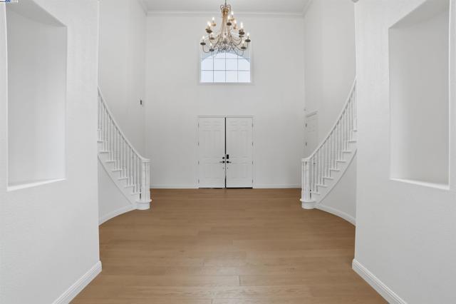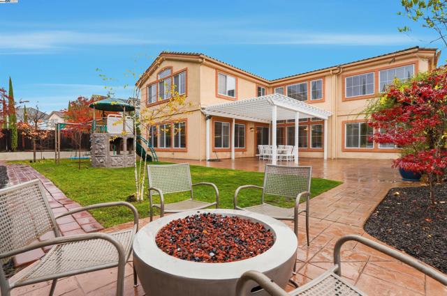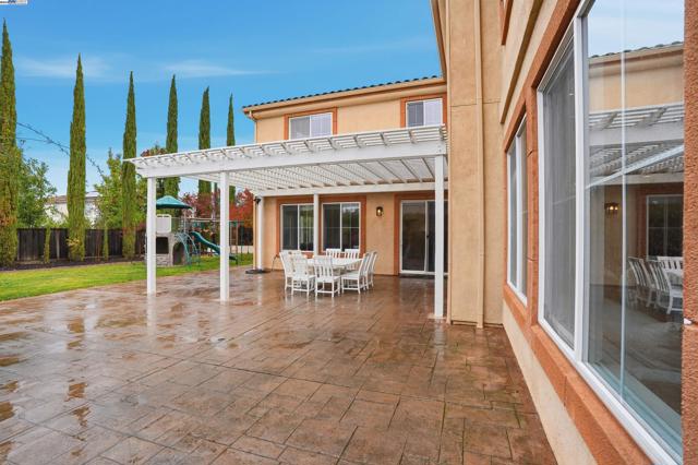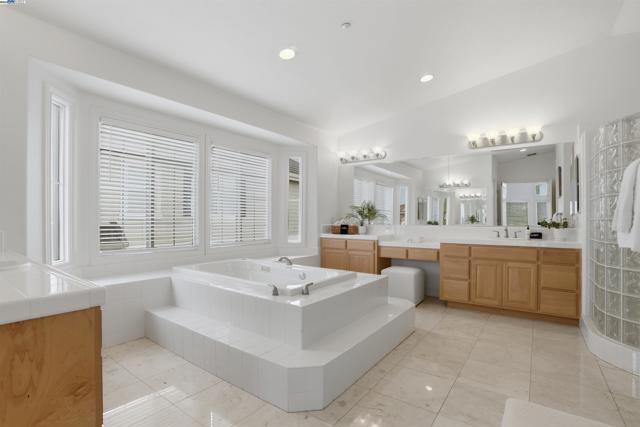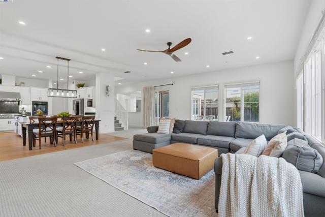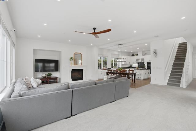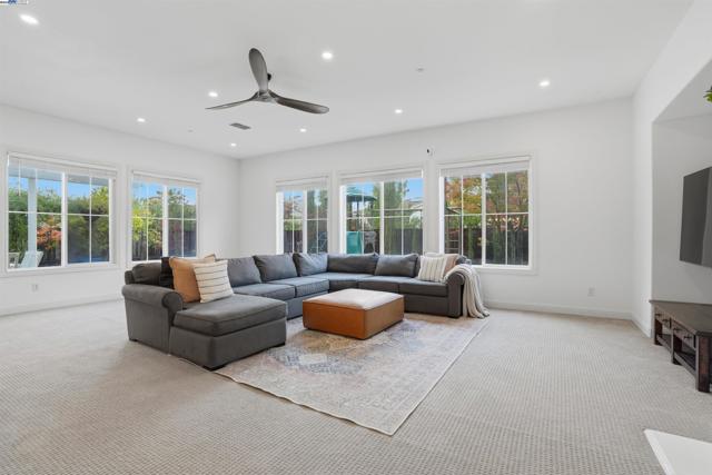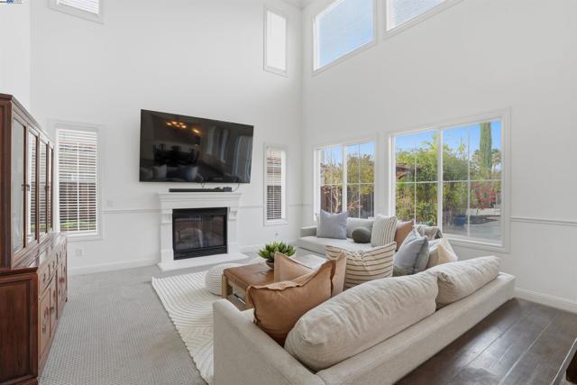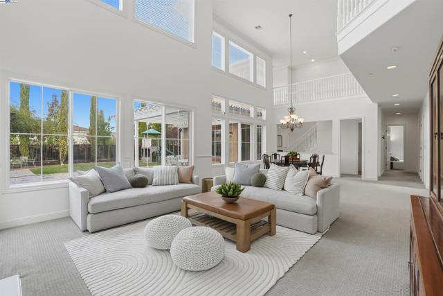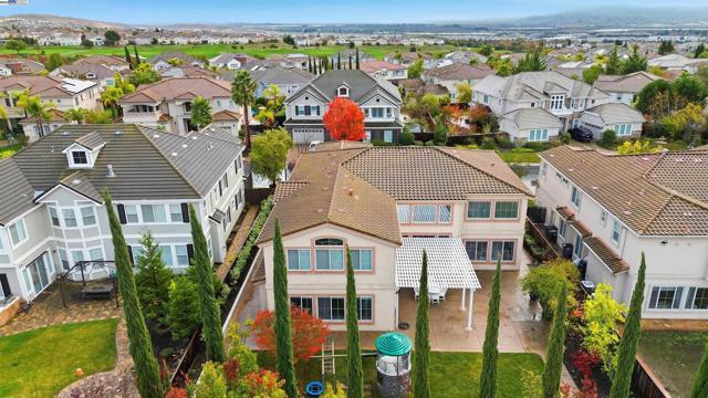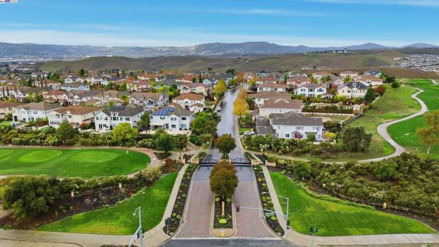 Welcome to this Toll Brothers Atherton executive home, ideally located in East Dublin’s prestigious gated community of Pinnacle Ridge. This elegant 5 bedroom plus office, 5.5 baths, east-facing residence greets you with a grand two-story entry, highlighted by a dramatic dual staircase, soaring ceilings, and refined crown molding. The main level features a spacious den/office, a bedroom with its own en-suite bath, and an additional guest bathroom—perfect for guests or multi-generational living. The chef’s kitchen impresses with a large center island, granite countertops, custom cabinetry, and high-end appliances, providing the ideal setting for cooking, gathering, and entertaining. Retreat to the luxurious primary suite, complete with dual vanities, a jetted soaking tub, a walk-in shower with dual shower heads, and two generous walk-in closets. The upstairs also offers spacious secondary bedrooms, providing comfort and privacy for the whole family. Step outside to a professionally landscaped backyard, where lush garden beds and mature trees surround an expansive patio—perfect for outdoor dining, play, and relaxation. Additional highlights include a three-car garage and an unbeatable location close to shopping, dining, top-rated schools, freeway access, and BART.