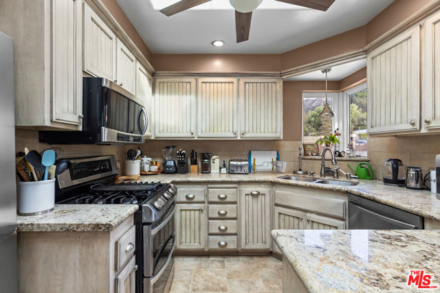 Welcome to a rare Tujunga retreat offering nearly 3,700 square feet of combined living space, a sparkling pool and exceptional versatility for multi-generational living, extended family, creative work or income potential. The main residence spans 2,682 square feet, filled with natural light thanks to multiple skylights and a wall of large windows that frame the lush, tree filled setting. The spacious living room feels bright and elevated. The formal dining room is perfect for entertaining. With four generous bedrooms and two bathrooms, the main residence provides comfortable and flexible living. Downstairs, discover an additional 1,000 square foot one bedroom apartment with its own private entrance and patio. Thoughtfully updated, this expansive space includes a full kitchen, living room, bedroom and full bathroom. Ideal for guests, rental income or multi-generational needs. Importantly, this is not a garage conversion- the property retains its full garage, offering added flexibility for storage, parking or future expansion. Outside, the pool area is perfect for lounging and entertaining, complete with a diving board and wide open patio space. A gated extra long driveway provides parking for up to 4 vehicles in addition to the garage. Situated on a peaceful street surrounded by mature trees on a 0.32 acre lot, this home offers space, privacy and incredible utility in one of Tujunga's most desirable pockets. As an added bonus, the seller will replace the kitchen countertops during escrow. Buyer may choose from a curated selection of seller approved materials and the work will be completed by the seller's chosen licensed contractor who has already measured the space. This gives the buyer a personalized upgrade without delays or added expense.