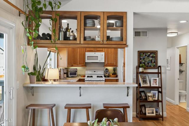 Welcome to Mandalay Shores, a beach community known for great waves, miles of beaches, stunning sunsets and an idyllic lifestyle where outdoor activities abound. Four spots back from the sandy shores of Mandalay Beach, this coastal condo makes a great full-time home or weekend getaway. Filled with convenient features, this is a well-kept property to enjoy right away.The 'penthouse' of the building, 5463 Driftwood stretches over the garages, meaning there are no downstairs neighbors. Once up the private exterior stairs that lead to the home, there is a modern Dutch Door entry, which allows cool ocean breezes to fill the space. A great-room style kitchen, dining and family room have mountain views, natural light, soaring ceilings and a large balcony. Two bedrooms and two baths are on the same level, one with its own northwest-facing balcony. There is an efficient bonus of a laundry area in the hall bath with room for full-size appliances. Upstairs is a spacious flexible space, currently styled as an office and family room. With ocean views, this could also make a primary or guest sleeping room. With its west and northwest exposure, this home is bright throughout the day, and its views include the ocean, Channel Islands, and the famed Topa Topa mountains of Ojai, where the breathtaking 'Pink Moment' is a visual treat as the sun sets. In the cooler months, waking up to see snow capping the Topa Topas is a special surprise, something unexpected from a home so close to the beach! On the ground, there is a single-car garage and a dedicated parking spot on the end, with plenty of room to store beach toys, boards, and more. The BBQ patio next to the parking spot is reserved for this unit. Ask about the possible golf cart inclusion! This home is well-located with the beach proximity as the main act. Other highlights include: newer windows, freshly-painted building, recently-refreshed patio decks and staircase, hard-surface flooring ideal for the beach, kitchen with durable and upgraded counters and rich wood cabinetry, updated light fixtures inside and out, close proximity to the Channel Islands Harbor, Seabridge Marina and the award-winning olol'koy Beach Park.