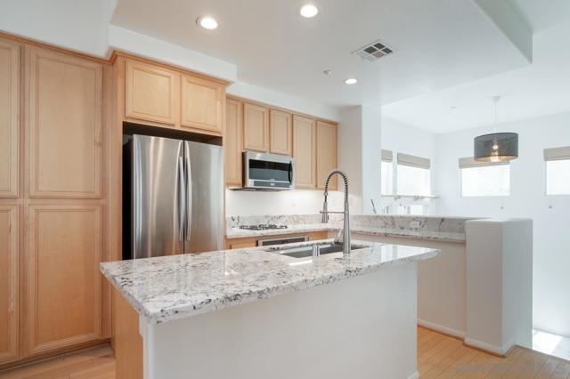 Highly upgraded DETACHED townhome in Mission Valley within the Villas at Escala gated community! This 2-bedroom with a flex space ideal for an office/den, 2.5-bath residence offers 1,443 sq ft of thoughtfully designed living space. Step inside to tall ceilings, chic lighting, large contemporary tile and wood flooring, completely remodeled spa-like bathrooms with floating vanities, and stylish shutters in both bedrooms. The remodeled kitchen impresses with stone countertops, stainless appliances, a spacious island with a farmhouse sink, and bar seating—perfect for casual meals or hosting friends. Don’t miss the expansive private patio (not just a balcony), great for al fresco dining, pets, and entertaining. Additional highlights include a cozy gas fireplace, ceiling fans and attached 2-car garage with convenient in-unit laundry. Escala Club amenities: two pools, spa, tennis, pickleball, basketball, fully-equipped fitness center, party room with full kitchen, dog park, playground, barbecue/picnic areas, and walking trails—all with the LOWEST HOA dues in Escala. Warm and contemporary, this residence is located on the edge of a quiet cul-de-sac and offers a thoughtful combination of upgrades and sophistication not found in most Escala residences. The open-concept layout is light and bright with soaring ceilings and includes fully remodeled bathrooms, versatile bonus spaces, and a must-have patio/yard perfect for outdoor living and entertaining. The 2-car garage has more space than most in the community for added storage. Why settle for an attached condo when you can have your own home with ZERO shared walls offering maximum privacy! Escala is ideally situated across the street from and within walking distance to Costco, Lowes, IKEA, a City library, Fenton Parkway trolley stop, and numerous shops and restaurants. Residents are also just minutes from Snapdragon Stadium, Mission Valley Mall, Fashion Valley Mall, and only a 10-minute drive to the beach, providing the perfect blend of convenience and lifestyle. The revered Escala Club features a state-of-the-art fitness center, two swimming pools, spa, and two multi-use courts for tennis, pickleball, and basketball, along with changing rooms with lockers and showers, a private club room, and professional on-site management. Residents also enjoy barbecue and picnic areas, a dog park, a children’s playground, media room, and nearby walking trails. Prime location near Friars Road offers world-class shopping, dining, and services, plus easy access to the I-15, I-8, I-805, and 163 freeways.
