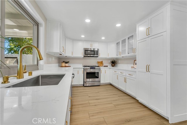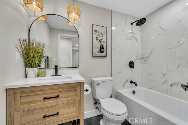 Welcome to this completely updated family home designed for effortless modern living, located on a quiet street in a highly sought after Santa Clarita neighborhood. This move in ready residence spares no expense, featuring elegant custom windows and brand-new flooring throughout, complemented by stunning recessed and modern lighting fixtures. This gem also boasts new paint, and plumbing that assures worry free maintenance for years to come, while the HVAC system has been recently serviced and paired with a new Nest thermostat for ultimate efficiency. The heart of the home is the expansive kitchen, perfect for entertaining and daily life, while both bathrooms have been fully and flawlessly remodeled with contemporary finishes. Outside, enjoy the California weather on the beautifully designed patio complete with a barbecue setup, making entertaining a breeze. Additional features include the attached garage with laundry area and ample built-in storage, not to mention the leased solar panels and included Tesla Powerwall, which offer both incredible organization and significant energy savings, making this property a truly exceptional turnkey opportunity.