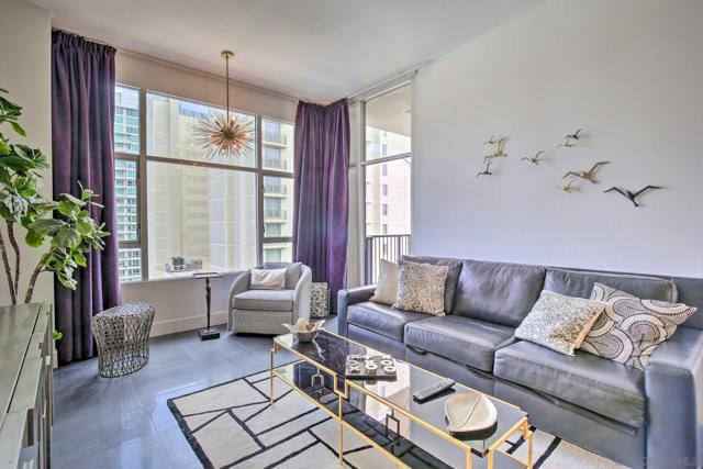 Please call to inquire about rental status. Exquisite furnished penthouse in the heart of downtown! Don't miss this pristine unit with upgrades galore! Features include high ceilings, large windows w/ abundant natural light, fresh neutral paint, custom kitchen with waterfall edge countertop & tile backsplash, upscale fixtures, upgraded bathroom with tiled shower/walls & in-unit laundry. Spacious balcony to enjoy views of Gaslamp. Well maintained building with secure entry, terrace with BBQs, gym & underground parking! Shopping & dining outside your door! Top floor upgraded condo with wonderful city views/night lights, high ceilings and balcony. Close to the Convention Center and Petco Park! Northeast corner unit with views towards The Park @ The Park (Petco Park), eastern mountains, peek view of Bay & Coronado Bridge, North towards Balboa Park! Extra high ceilings w/beautiful tile floor & nice sized balcony, beautiful chandeliers/lights in all the ceilings, custom kitchen with waterfall edge countertops and tile black-splash, upscale appliances, upgraded bathroom. Laundry in unit, brand new washer/dryer, and spacious balcony to enjoy views of Gaslamp. No smoking, no pets..