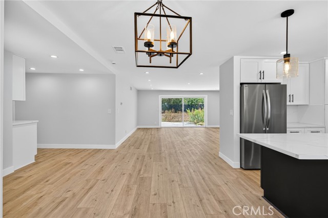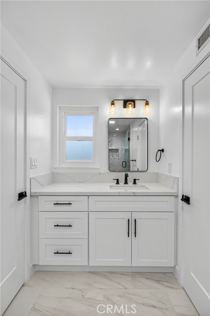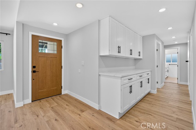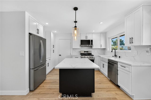 Welcome to this beautifully reimagined residence, perfectly situated on a tranquil tree lined street framed by blooming Jacaranda trees each spring. Thoughtfully renovated with a focus on quality craftsmanship and timeless design, this home offers an elevated living experience that blends modern comfort with refined sophistication. From the moment you step inside, you are greeted by smooth finished walls, elegant ceilings, and premium vinyl plank flooring that flows seamlessly throughout. Every interior door, entry door, and closet door has been replaced, creating a cohesive and polished aesthetic. A custom built hallway vanity with upper and lower cabinetry and a sleek quartz countertop provides stylish and functional storage while enhancing the home’s upscale appeal. The fully renovated bathroom serves as a serene retreat, featuring a custom vanity, designer tile work, a new soaking tub, and contemporary lighting that evokes a spa like atmosphere. The kitchen is both beautiful and functional, showcasing shaker style soft close cabinetry, quartz countertops, and an oversized island with seating, ideal for both intimate meals and large gatherings. The open floor plan extends into the bright and inviting family room, complete with a cozy fireplace and sliding glass doors that lead to the backyard, creating a seamless indoor outdoor living experience. The expansive, level backyard offers endless potential, whether you envision building an ADU, designing a resort style pool, or creating a private garden oasis. Additional highlights include a dedicated laundry room, a spacious two car garage, and a versatile backyard shed that can serve as extra storage or a creative workspace. With sophisticated updates, exceptional attention to detail, and a highly desirable location, this home stands out as a rare opportunity to enjoy elevated living in a peaceful, picturesque setting. It is a truly move in ready property that combines luxury, comfort, and future potential in one beautiful package.