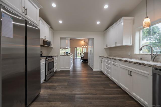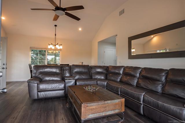 Extraordinary home and property, walking distance to the Vista Library and Vista Village as well a Park! Take advantage of the Wrap Around Deck to admire the hills and your private oasis backyard, featuring an in ground pool, separate spa, gazebo and landscaping! The home can be used for a single family, or has been enhanced to be two units, both with access to the back yard. Open the door to a formal entry, leading to the living room/dinning room, 2 bedrooms - one can be used as a 2nd (or 1st) Primary Suite with a wood burning fire place, French Doors that lead to the wrap around deck with views, walk in closet and Ensuite Bathroom with large shower. Walk through the living room to the Kitchen Doorway, enter and feel how open the Kitchen, walk in Pantry with space for a stacked washer/dryer, Eating Area combined with the Family Room with wood burning FP is. Bright and Airy, French Doors leading to the wrap around deck, stairs then leading to pool area. Downstairs a Large Primary Suite with loads of closet space, a separate office space, and large Primary Bathroom. Additional downstairs is a Den/Bedroom, additional bedroom with bathroom (doorway to pool area, great while entertaining in the backyard), kitchenette, washer and dryer. While no garage, there is a Large Metal Carport - RV storage or parking. Shed for storage with two additional storage areas. EV Charging at driveway parking area nearer to street. A great house for get togethers, entertaining, and parties! Must feel and see to believe!