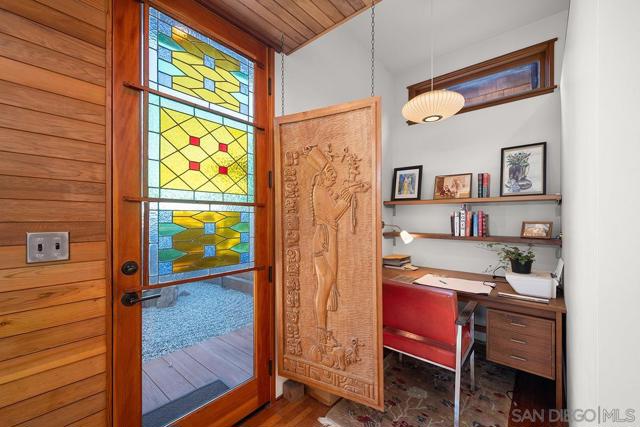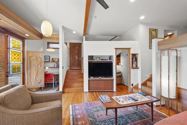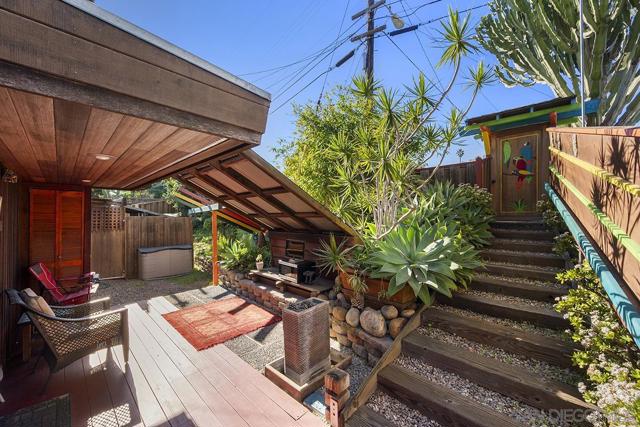 One-of-a-kind multi-generational and income-producing opportunity in San Diego, ideal space for an artist retreat. The Frank Lloyd Wright inspired main home features 1 bedroom and 2 baths with a sunken living room, soaring 10-foot ceilings, built-in cabinetry, cedar ceiling in the primary bedroom, distressed fir and cork floors, ancient redwood accents, and custom wood windows and doors. Enjoy a private backyard with a tranquil zen garden, balcony, and fireplace. The main house is 1,150 sqft and connected is the original house 750 sqft 2-bedroom, 1-bath house and a 350 sqft ADU, thoughtfully arranged to provide privacy while offering versatile living and rental options. Perfectly located near shopping and local amenities. This is truly a rare opportunity to own in the heart of San Diego.