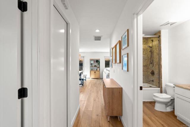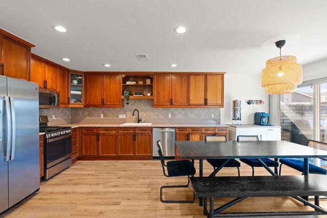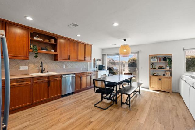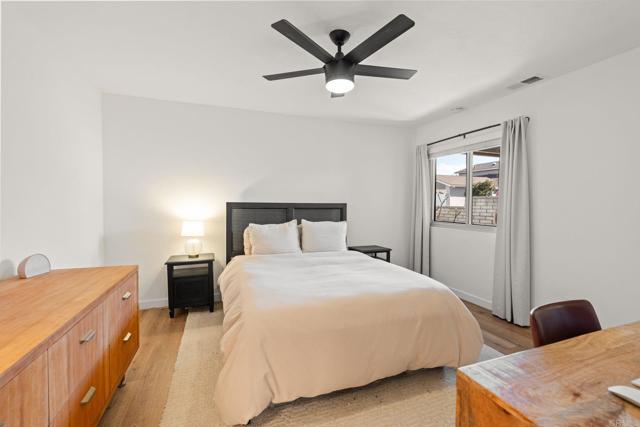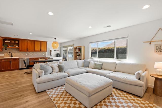 Single story end unit condo in the desirable Vista de Oceana community. No age restrictions and VA financing approved. Conveniently located just minutes from the coast, shopping, dining, and the Emerald Isle Executive Golf Course. This 2 bedroom, 2 bath home is move in ready and features an open floor plan with bedrooms positioned on opposite sides of the home for added privacy. Home has an abundance of natural light. Upgrades included recessed lighting, newer laminate flooring, updated baseboards, new interior doors, dual pane slider and dual pane windows throughout. The kitchen offers granite countertops, custom cabinetry with pull-out drawers, and newer appliances. The primary suite includes dual mirrored closets and an en-suite bathroom with granite countertops and a walk-in shower. Enjoy outdoor living with both a front porch and a private back patio that opens to a grassy yard, a rare feature for condo living. Additional features include in-unit laundry, an attached one-car garage, air conditioning, and ceiling fans in both bedrooms. All just a couple miles from the beach, this home offers easy coastal living in one of Oceanside’s most convenient locations.