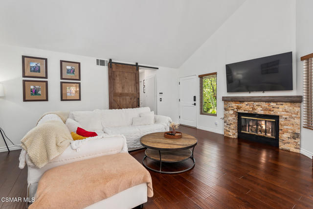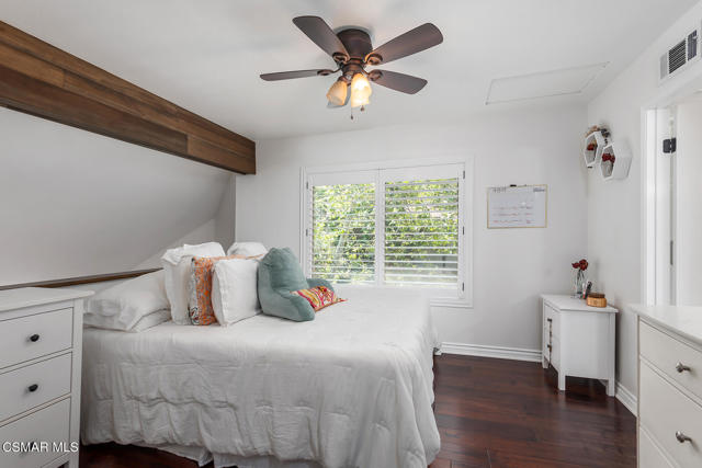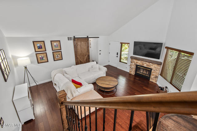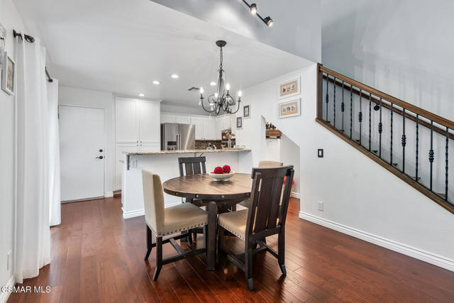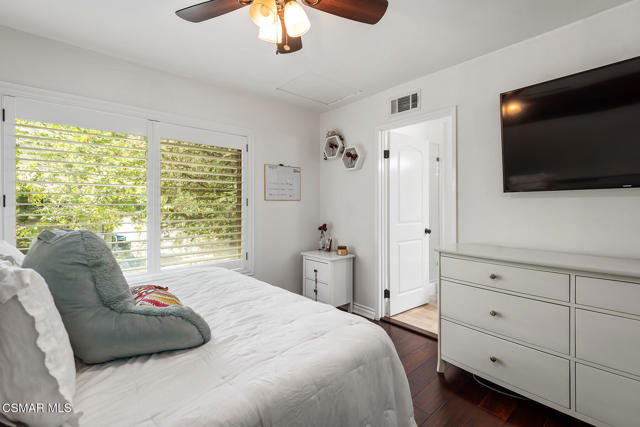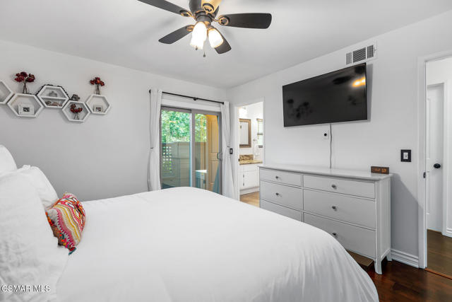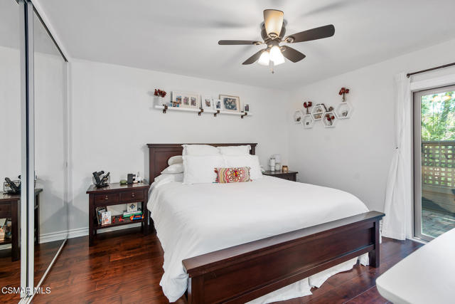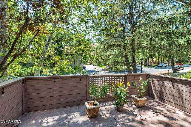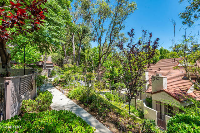 Stunning 2 bedroom, 2 bath townhome nestled in the quiet, highly desirable neighborhood of Hidden Canyon in Westlake Village. Premier end unit with highly sought after floor plan boasts a downstairs primary bedroom and an upstairs bedroom with an ensuite bathroom. This immaculate, turn-key home features stunning wood/like laminate flooring, freshly painted interior, dual pane windows and custom lighting, fixtures and upgrades throughout. Gorgeous kitchen includes granite countertops with glass tile backsplash, beautiful white cabinetry, and high end stainless steel appliances. Living room with stacked stone gas fireplace, wood blinds and separate dining area with custom chandelier and slider to outside patio. Downstairs primary bedroom has ceiling fan, mirrored closet doors and slider to private outside patio. Beautiful primary ensuite bathroom features white vanity with granite counters, oversize shower with subway tile and glass enclosure and custom lighting and fixtures. Upstairs bedroom has plantation shutters, ensuite bathroom and boasts the same beautiful features as the primary. Staircase has custom iron railing and wood handrails, and a private nook under the stairs for additional space. Oversize 2 car garage with custom storage. Great neighborhood with multiple pools, spas and close to hiking/biking trails, shopping, restaurants and award winning schools. Come make it yours!