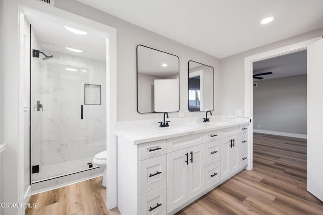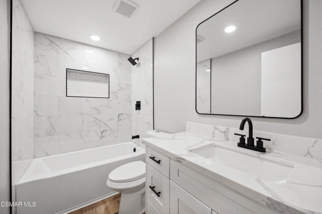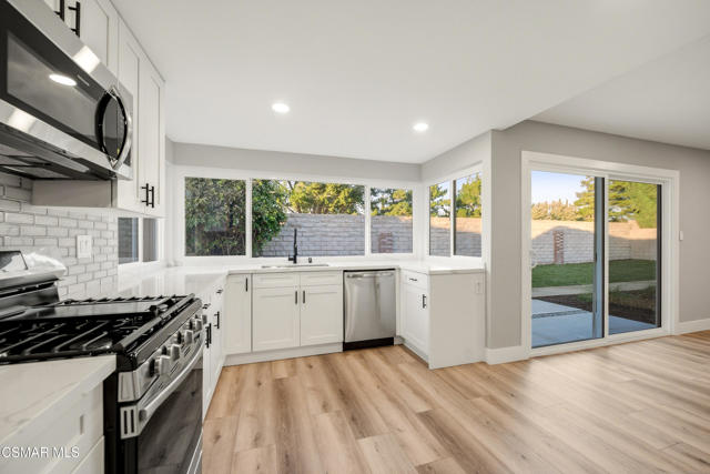 Fully remodeled single story home nestled in Central Simi. This home boasts 3 bedrooms and 2 bathrooms. Laminate floors and new dual paned windows throughout. Kitchen is equipped with quartz countertops, tile backsplash, and stainless steel appliances. Guest bathroom with a tileshower/tub. Master en-suite with dual sinks, quartz counter tops, and a tile shower. The backyard has been newly landscaped with fresh sod and concrete patio area.