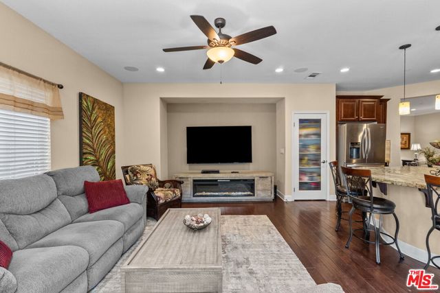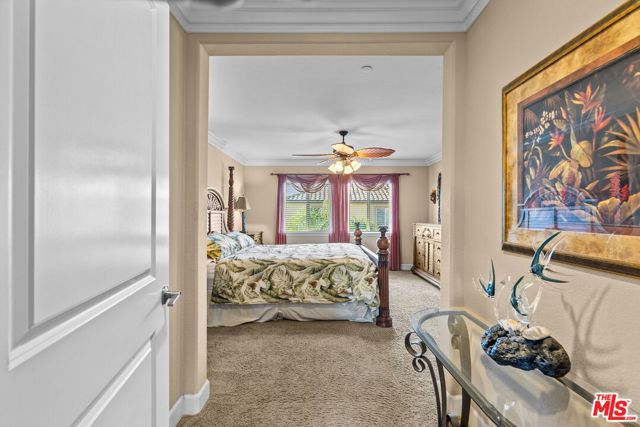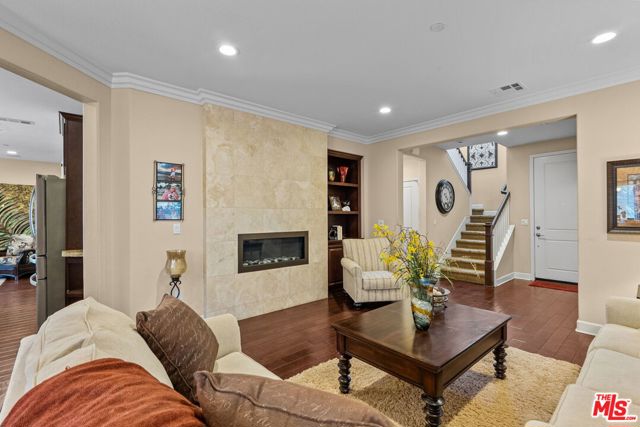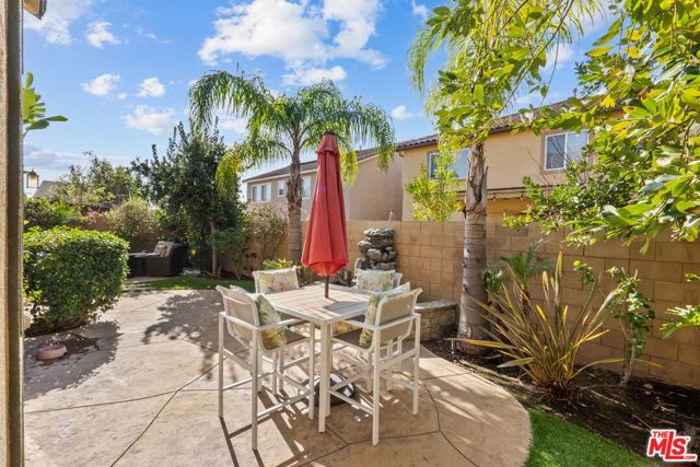 Welcome home to Living Smart Homes in Moorpark Highlands, located in one of Moorpark's most desirable master-planned communities. This charming two-story 4-bedroom, 2.5-bath home is surrounded by lush greens and beautiful mountain views. Step inside to a welcoming entry where high ceilings, crown molding, recessed lighting, rich wood floors, and natural sunlight set the tone. The space opens into an elegant formal living and dining area perfect for entertaining. The kitchen floor plan blends well to the family room, creating an ideal open-concept layout. The kitchen features rich cabinetry, granite countertops, custom tile backsplash, a large center island with bar seating, pendant lighting, stainless-steel appliances, and a modern touch-activated faucet for added convenience. The adjoining family room offers a comfortable gathering space with a sliding glass door to the backyard for effortless indoor-outdoor living. Additional features include direct access to the attached garage, central heating and air conditioning for year-round comfort, dual-pane windows for energy efficiency, ceiling fans and thoughtful finishes throughout. As you make your way upstairs, you arrive at a spacious landing. This versatile space connects all bedrooms, a full bathroom, and a large laundry room for added convenience. The primary suite serves as a private retreat, offering generous space, a walk-in closet, and an ensuite bathroom with dual vanities, a soaking tub, and a separate glass-enclosed shower, creating a spa-like atmosphere. Backyard highlights include stamped concrete, mature palms, a decorative water feature, an orange tree, and a built-in natural gas BBQ hookup for effortless outdoor entertaining. A side yard provides added versatility for pets or storage. The Moorpark Highlands community offers resort-style amenities including a pool, spa, scenic trails, and access to Mammoth Park, featuring 7.5 acres of play areas, multi-use fields, picnic spaces, and lighted tennis and sport courts. Conveniently located near shopping, dining, award-winning schools, and freeway access, this home is nestled in a highly desirable, family-friendly neighborhood.