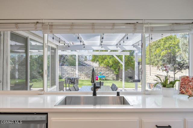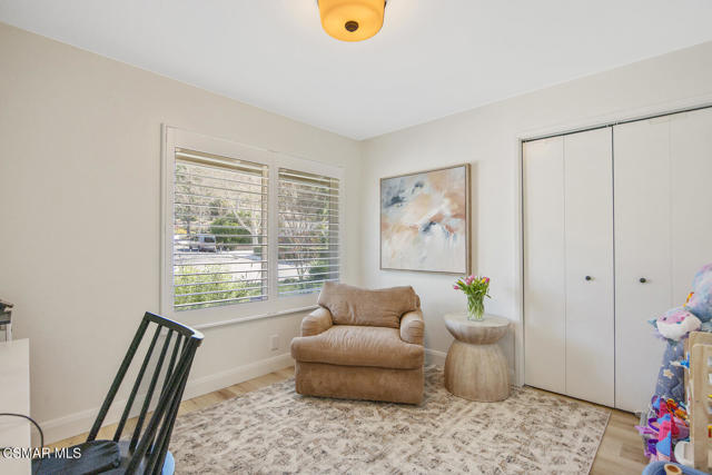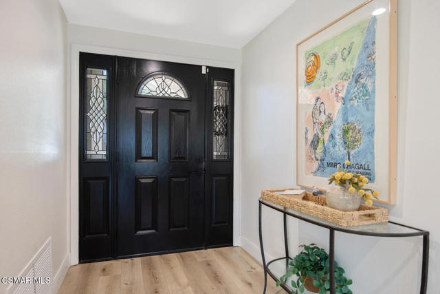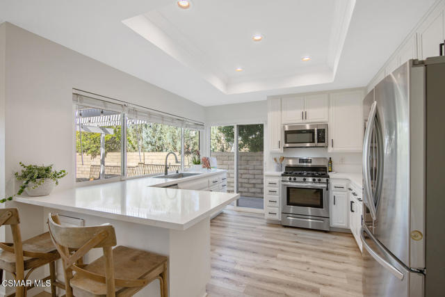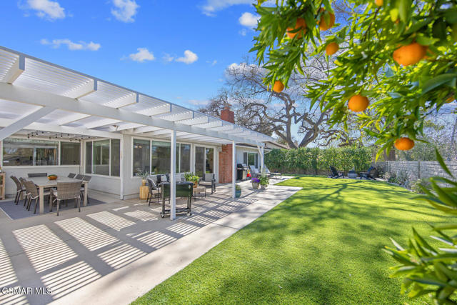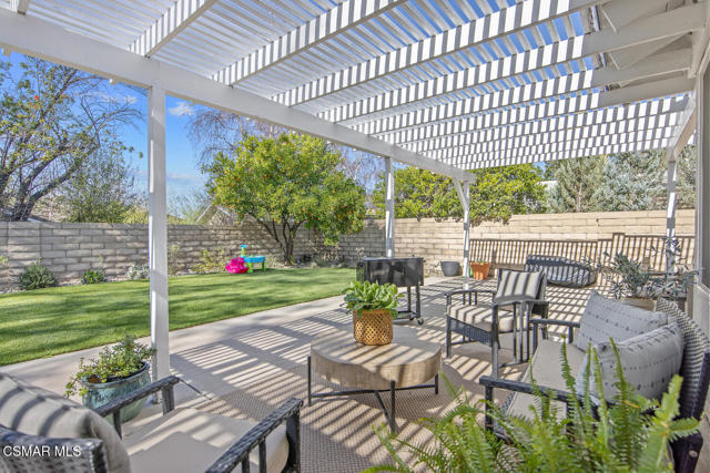 Welcome to this fully updated single-story home located in the highly desirable Westlake Hills neighborhood. With tons of natural light, the open-concept layout features soaring high ceilings, an expanded kitchen, recessed lighting, a gorgeous fireplace with custom tile work, and newer wide plank designer flooring. This bright and welcoming atmosphere is ideal for both everyday living and entertaining. Step outside to the extraordinarily spacious and peaceful backyard with lovely mountain and tree views, new easy-care turfed landscaping and drip irrigation, mature fruit trees, large patio, a cozy newly paved fire pit deck and a dedicated dog run. This backyard has amazing sunset views and provides privacy and serenity perfect for relaxing evenings or gatherings with friends and family. Both bathrooms have been tastefully updated, including a primary suite with an enlarged shower with bench seating and dual sinks. The second bedroom is enhanced with custom organization by California Closets, maximizing functionality and storage. Additional upgrades include a new HVAC system with updated ducting, new electrical panel, newer tankless water heater, newer double pane windows, a garage with epoxy floors, an EV charger, and a large overhead storage space with a pull-down ladder. TVs in the home are hardwired in the walls for optimal streaming performance. Situated in a convenient and coveted neighborhood in the heart of Westlake Village, with a low voluntary HOA, residents enjoy access to beautiful walking greenbelts for easy access to a top-rated elementary school, parks, restaurants, shopping, and nearby hiking trails. This turnkey home combines comfort, style, and an unbeatable location.