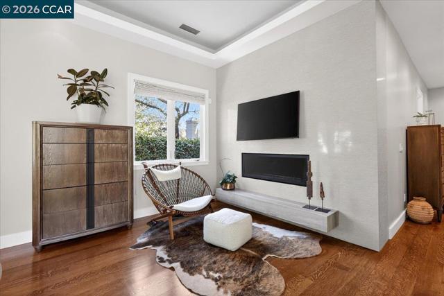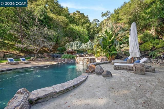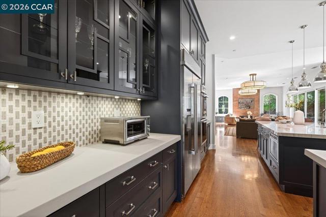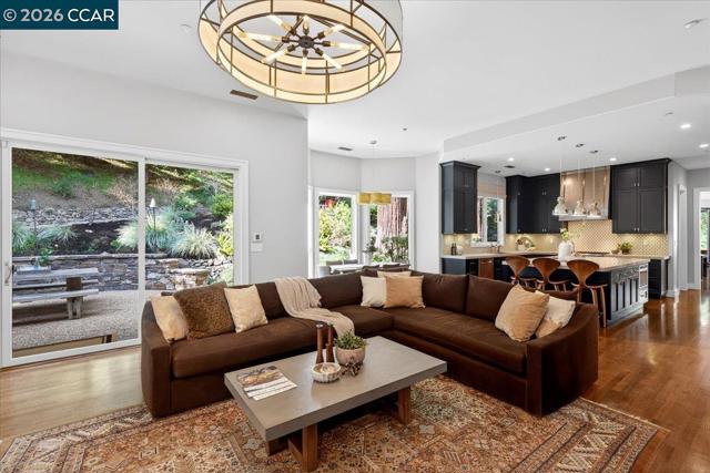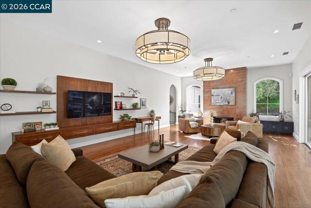 A striking contemporary estate celebrating California’s indoor-outdoor lifestyle, marked by architectural presence and modern elegance. Soaring ceilings, hardwood floors, designer lighting, and expansive glass elevate its sophisticated design. The formal living room features a gas fireplace, tray ceiling with cove lighting, hurricane sliding doors, dining area, and wine closet for approx. 200 bottles. The gourmet kitchen offers Thermador appliances including six-burner range, double ovens, dual Bosch dishwashers, prep sink, expansive island, soft-close cabinetry, under-cabinet lighting, and bay-window nook with garden views. The family room includes a gas fireplace, custom built-ins, and patio access. Bedrooms include a Jack and Jill suite, versatile bedroom with built-ins, and private wing with guest suite. The primary suite offers its own fireplace, patio access, walk-in closets with custom organizers, and spa-style bath with double vanity, freestanding soaking tub, dual shower heads, and bidet features. Resort-style grounds showcase an infinity-edge Pebble Tec pool and spa with cascading water and slide, patios, paver walkways, outdoor kitchen, fireplace, sport court, greenhouse, and mature redwoods. Ideally located just minutes to town, commute routes, and top-rated schools.