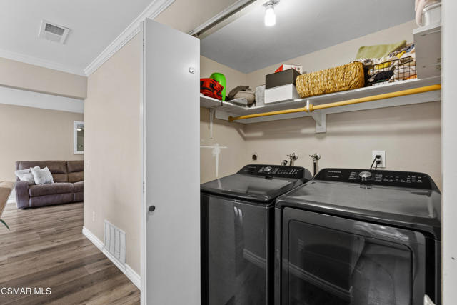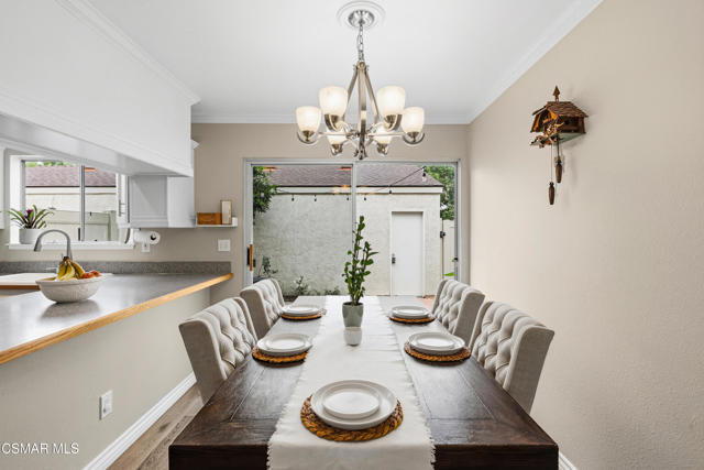Located in the highly desirable Varsity Park community, this rare 4-bed, 2.5-bath townhome offers space, style, and a tranquil setting. Step inside to a light-filled open floor plan highlighted by wide-plank wood-like flooring and recessed lighting throughout the main living areas. The spacious living room features a stunning stacked-stone fireplace with a custom mantel and flows seamlessly through sliding glass doors to a private rear patio--creating the ideal indoor-outdoor lifestyle.The kitchen showcases crisp white cabinetry, stainless steel appliances, generous counter space, and a breakfast bar that opens to a spacious dining area--perfect for both everyday living and entertaining. The versatile layout includes a convenient downstairs bedroom and powder bath, ideal for guests, a home office, or multigenerational living. Upstairs, three additional bedrooms await, including a spacious primary suite with dual closets and abundant natural light. Additional highlights include central A/C, an in-unit laundry closet, and a 2-car detached garage with direct access to the back patio. Varsity Park offers lush greenbelts, mature trees, and two sparkling pools--providing a peaceful retreat just moments from everyday conveniences. Ideally located near shopping, parks, Moorpark College, and with easy access to the 118 and 23 freeways, this home delivers the perfect balance of comfort, convenience, and community. Welcome home!