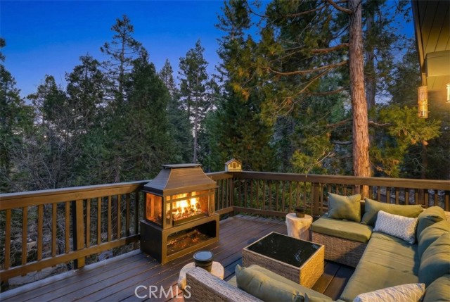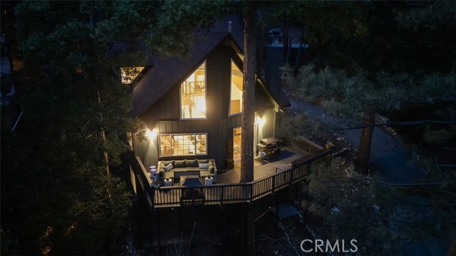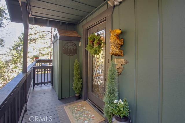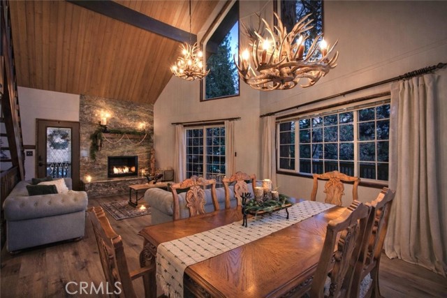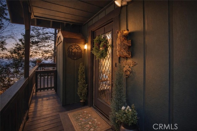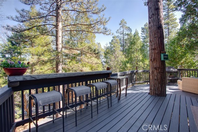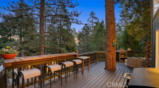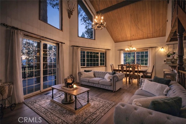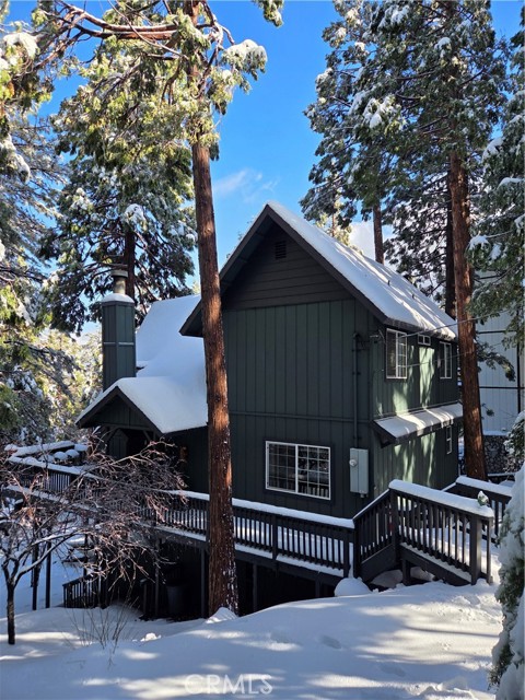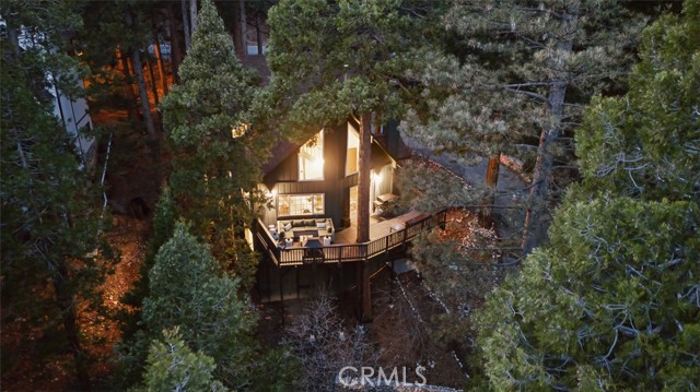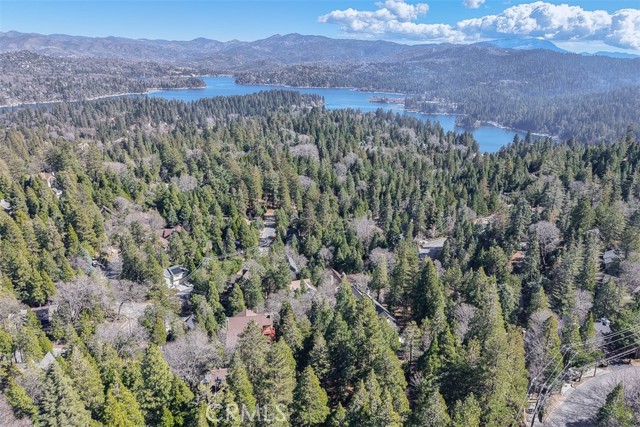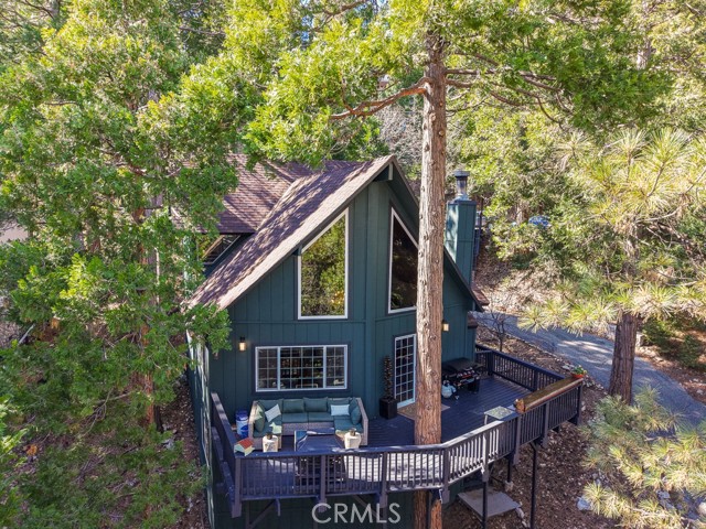Tucked in the forest in the heart of Lake Arrowhead this Prow style cabin has been carefully and lovingly curated to embody the perfect mountain retreat. Starting with the lush forest shades of the exterior and continuing into the interior where natural light, textures and stone and a touch of whimsy make this home the one you have been waiting for! Enter through the beautiful, beveled glass French Door into a spacious living area with soaring cathedral ceiling, original wood beams, antler inspired chandeliers and a wall of glass to bring the forest in! The striking slab granite floor-to-ceiling fireplace is the home’s centerpiece showcasing the rare beauty of natural stone and providing the perfect gathering space for friends and family. Directly outside is a large, inviting wrap around deck with areas for al fresco dining, relaxing in front of the outdoor fireplace, reading, watching the wildlife or just listening to the breeze rustling through the pines. The living area flows into the open dining room and upgraded kitchen with classic appliances, a whimsical Coffee Bar and dynamic granite counter-tops that mirror nature’s crisp and warm forest hues. Luxury vinyl flooring throughout complements the home with its warm wood texture. The primary ensuite is a private sanctuary on the main floor with attached bath that continues the warm and moody ambiance of the home. Upstairs are two private bedrooms or opportunities to pursue your private lifestyle choices for studios, fitness or wellness rooms and an upgraded bath with mountain character and upgrades. The lower level has a spacious, warm and inviting lounge and game room with its own private entrance, laundry and storage. The home is freshly painted inside and out and is furnished per Positive Inventory List. There are Milgard Dual Pane windows and a new Electrical panel too! Most importantly, the home has lake rights to private Lake Arrowhead which is just a few minutes’ drive away. There is a two-car parking pad on the quiet, plowed and maintained road and additional car and boat parking below on the dual access road. This woodsy hideaway would make the perfect mountain home, vacation home, rental or investment property. Come on up and enjoy the fresh mountain air and all Lake Arrowhead has to offer - the newly renovated Lake Arrowhead Village, Skypark, Snow Valley and acres and acres of National Forest for all your favorite adventures!