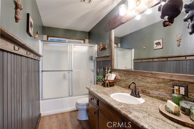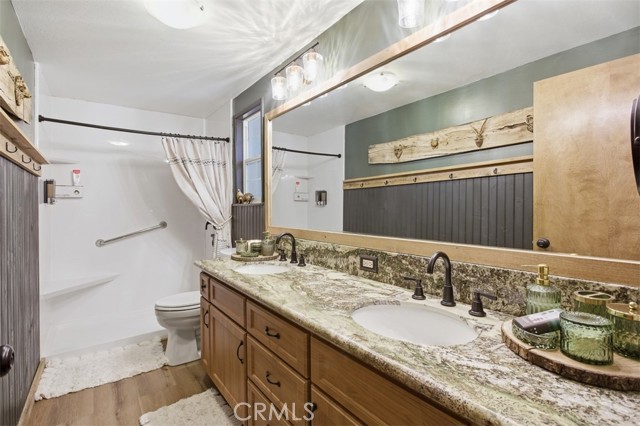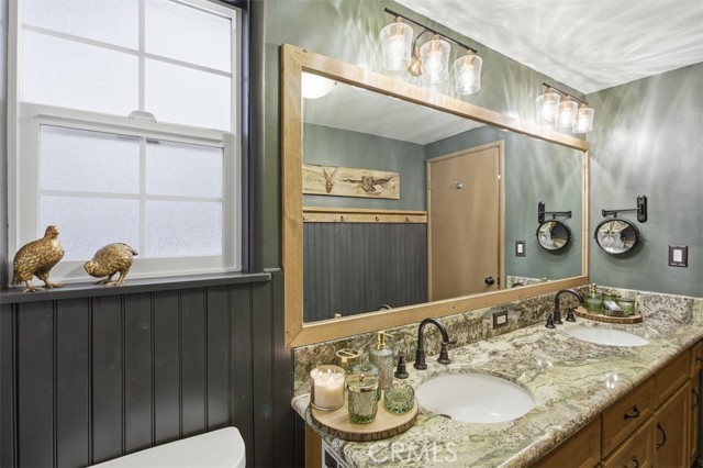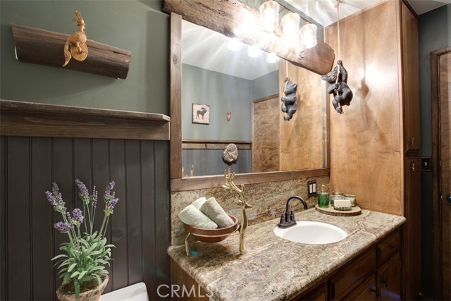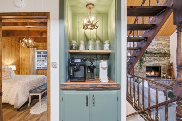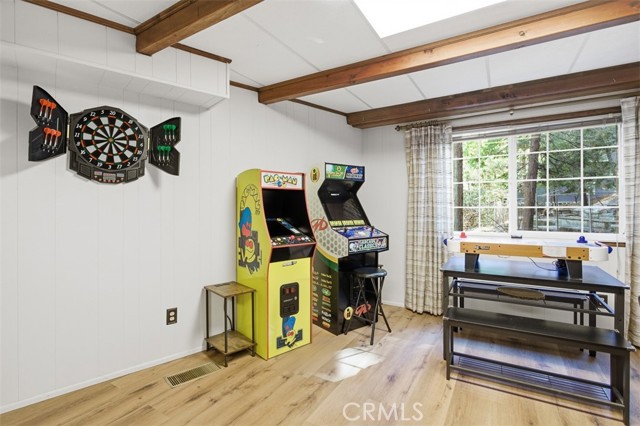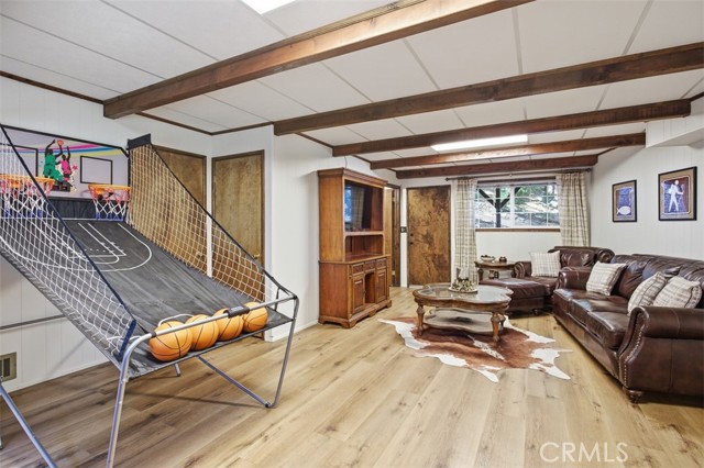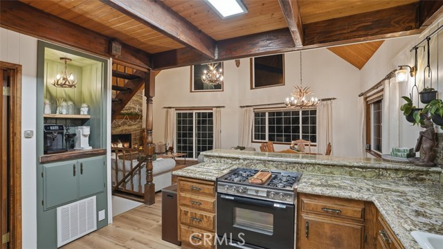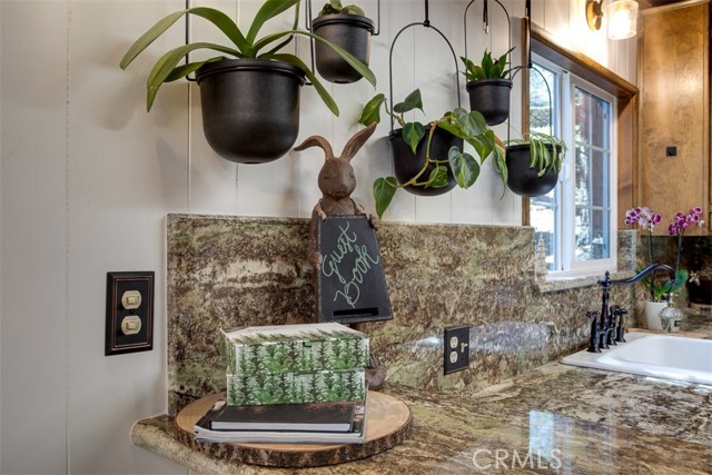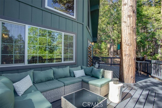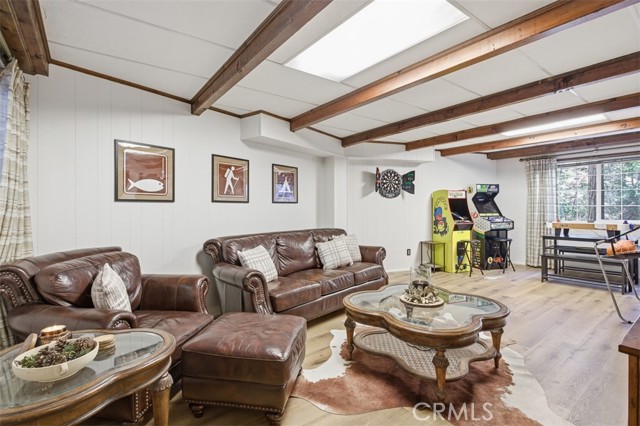 Tucked in the forest in the heart of Lake Arrowhead this Prow style cabin has been carefully and lovingly curated to embody the perfect mountain retreat. Starting with the lush forest shades of the exterior and continuing into the interior where natural light, textures and stone and a touch of whimsy make this home the one you have been waiting for! Enter through the beautiful, beveled glass French Door into a spacious living area with soaring cathedral ceiling, original wood beams, antler inspired chandeliers and a wall of glass to bring the forest in! The striking slab granite floor-to-ceiling fireplace is the home’s centerpiece showcasing the rare beauty of natural stone and providing the perfect gathering space for friends and family. Directly outside is a large, inviting wrap around deck with areas for al fresco dining, relaxing in front of the outdoor fireplace, reading, watching the wildlife or just listening to the breeze rustling through the pines. The living area flows into the open dining room and upgraded kitchen with classic appliances, a whimsical Coffee Bar and dynamic granite counter-tops that mirror nature’s crisp and warm forest hues. Luxury vinyl flooring throughout complements the home with its warm wood texture. The primary ensuite is a private sanctuary on the main floor with attached bath that continues the warm and moody ambiance of the home. Upstairs are two private bedrooms or opportunities to pursue your private lifestyle choices for studios, fitness or wellness rooms and an upgraded bath with mountain character and upgrades. The lower level has a spacious, warm and inviting lounge and game room with its own private entrance, laundry and storage. The home is freshly painted inside and out and is furnished per Positive Inventory List. There are Milgard Dual Pane windows and a new Electrical panel too! Most importantly, the home has lake rights to private Lake Arrowhead which is just a few minutes’ drive away. There is a two-car parking pad on the quiet, plowed and maintained road and additional car and boat parking below on the dual access road. This woodsy hideaway would make the perfect mountain home, vacation home, rental or investment property. Come on up and enjoy the fresh mountain air and all Lake Arrowhead has to offer - the newly renovated Lake Arrowhead Village, Skypark, Snow Valley and acres and acres of National Forest for all your favorite adventures!