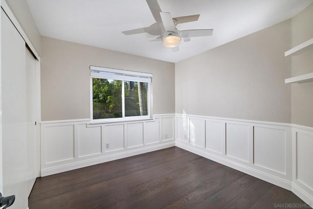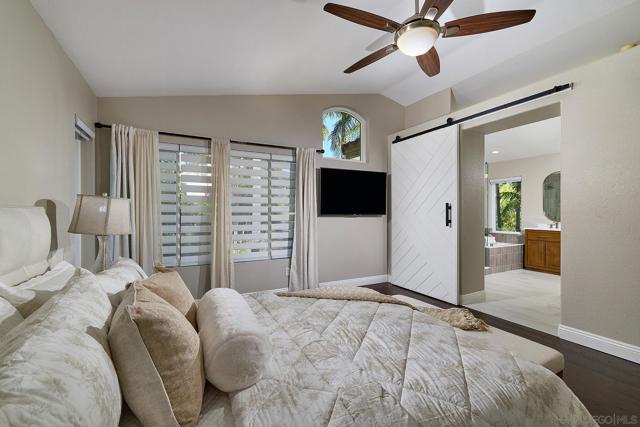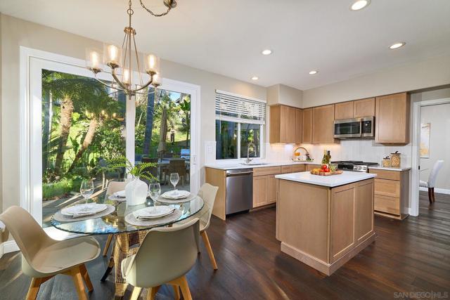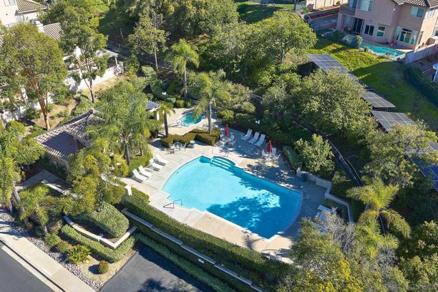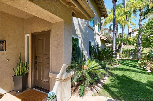Welcome home to Del Lago on the Greens, a gated community with 24/7 video monitoring located in South West Escondido. This 4-bedroom home has numerous features that will make you fall in love: Lots of windows providing natural light throughout the house, a private backyard with a built-in BBQ, natural flagstone, a large playset, and a retractable movie screen for evening entertainment, fresh interior paint, a remodeled kitchen with quartz countertops, new cabinets with soft close hinges, and Cafe appliances. All bathrooms have been remodeled with Quartz and new faucets, mirrors, and vanity lighting and the new cabinets also update the laundry room and linen cabinetry. Flooring is engineered wood, and the staircase has been updated with iron balusters. All windows and patio doors have been replaced in the last 5 years, as has the water heater (2024). The 3-car garage features extensive storage cabinets. There are no bedrooms downstairs.
