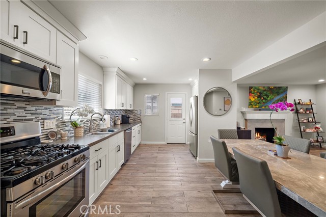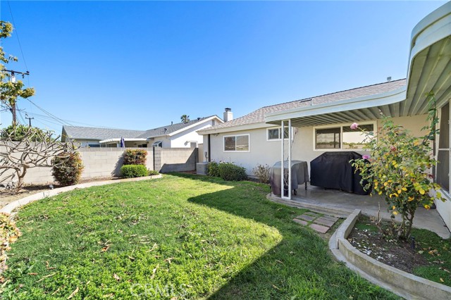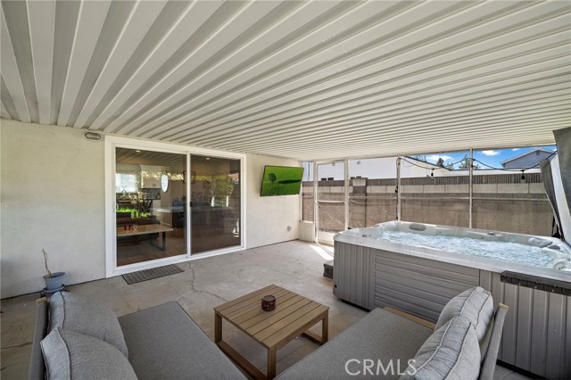 Welcome to 8181 Holland Drive, a beautifully updated 4-bedroom, 2-bath home nestled in the desirable Dutch Haven neighborhood of Huntington Beach. This inviting residence features a stunning gourmet kitchen with white shaker cabinets, soft-close doors and drawers, sleek quartz countertops, a full designer glass tile backsplash, stainless steel appliances, and recessed lighting. The home offers an open great-room layout enhanced by gorgeous, durable wood-look tile flooring that flows seamlessly through the living areas, kitchen, hallway, and bathrooms. Additional upgrades include smooth ceilings, dual-pane windows and sliding doors throughout. The spacious living room is highlighted by recessed lighting and a remodeled fireplace with an elegant mantel. Both bathrooms have been fully renovated with modern vanities, quartz countertops, updated sinks, faucets, fixtures, and beautifully tiled tub and shower surrounds. The primary bedroom features mirrored wardrobe doors and a private en-suite bath, complemented by designer paint, and classic six-panel doors. Additional features include central heating and air conditioning, a newer roof, smart home switches, a smart thermostat, and a newer water heater, newer electrical panel with electric car charger .A fabulous enclosed patio—complete with a relaxing jacuzzi tub—provides additional living and entertaining space (not included in the square footage). The spacious backyard, enclosed with block wall fencing, offers the perfect setting for gatherings with family and friends. Ideally located close to shopping, dining, parks, and just minutes from the beach—experience the best of Surf City USA living