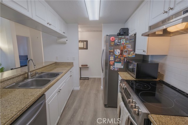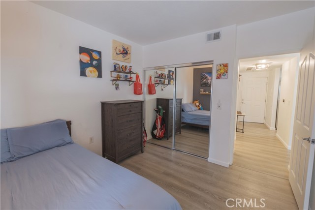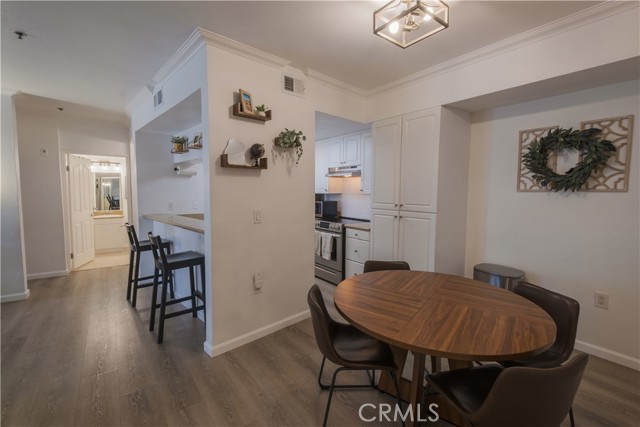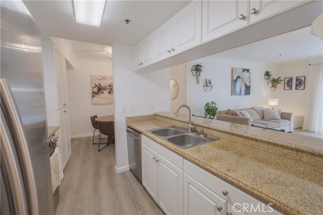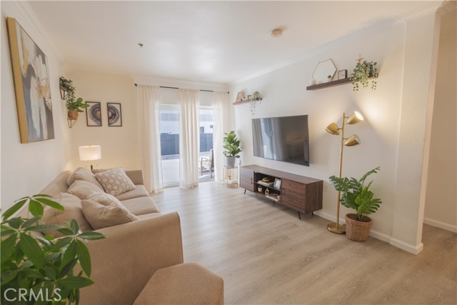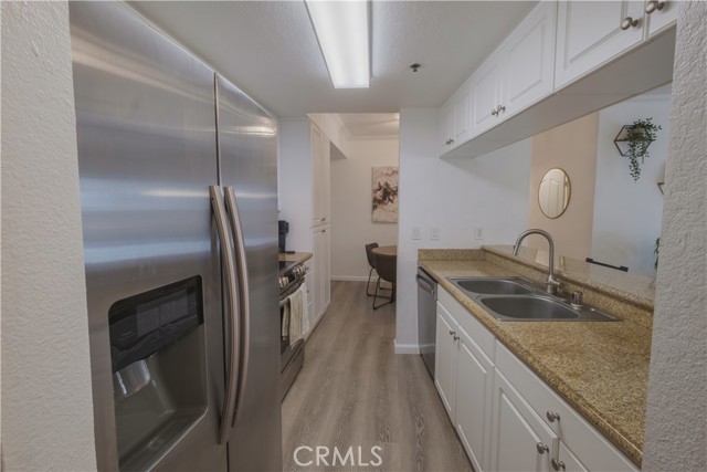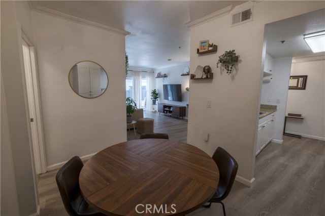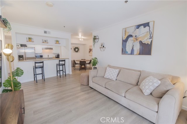 Welcome to The Pine Terrace. This two-bedroom, two-bath corner condominium features recent updates, including vinyl flooring throughout. The galley-style kitchen includes granite countertops, ample cabinet space, and opens to the living room. There is a breakfast bar as well as a separate dining area. This unit includes a private patio, one of a limited number of units in the building with this feature. The primary bedroom offers dual closets and direct access to the patio. Additional features include an in-unit washer and dryer. The property includes two assigned parking spaces in a gated garage and a secured bike storage area. Community amenities include a rooftop terrace with city views, a courtyard with BBQ area, and secured mail and package lockers. Located on Pine Avenue, the property is within proximity to downtown Long Beach, including restaurants, shops, and other local services. Buyer to verify all information, including square footage, permits, and HOA details.